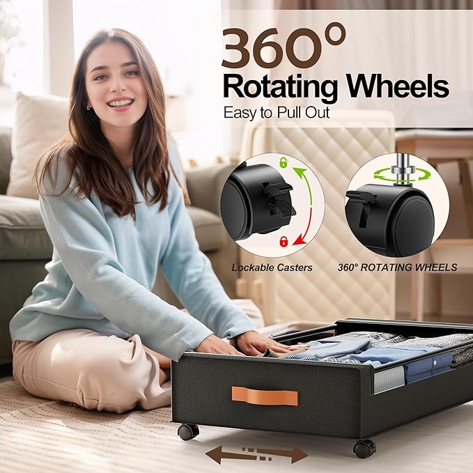 - Smooth & Lockable Wheels: Under bed storage dimensions: 30.7 x 16.9 x 6.7 inches (with wheels), (applicable under-bed height > 7 inches) Designed for effortless movement, our under bed storage bins features four 360° silent casters that glide smoothly without damaging floors or carpets. The built-in lock function keeps it securely in place, offering the perfect balance between mobility and stability. No more heavy lifting—just roll it out with ease