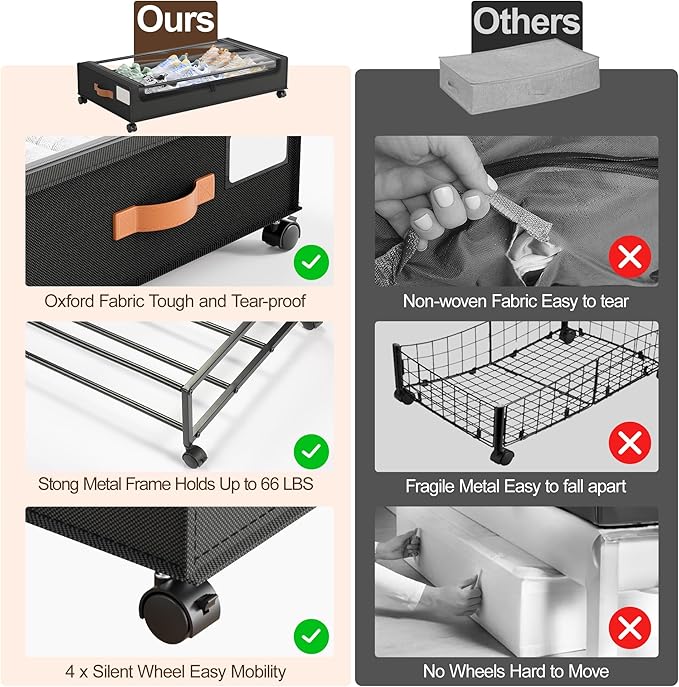 - Durable & Heavy-Duty Build: Made of 600D Oxford fabric with PU leather handles, LAMU underbed storage is tear-resistant and built to last. The sturdy all-metal frame supports up to 66 lbs, making it perfect for books, shoes, and more. Unlike flimsy metal mesh under bed storage containers, this design ensures durability and strength for long-term use