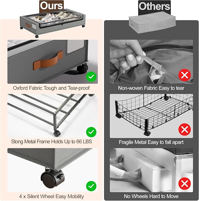 - Durable & Heavy-Duty Build: Made of 600D Oxford fabric with PU leather handles, LAMU underbed storage is tear-resistant and built to last. The sturdy all-metal frame supports up to 66 lbs, making it perfect for books, shoes, and more. Unlike flimsy metal mesh under bed storage containers, this design ensures durability and strength for long-term use