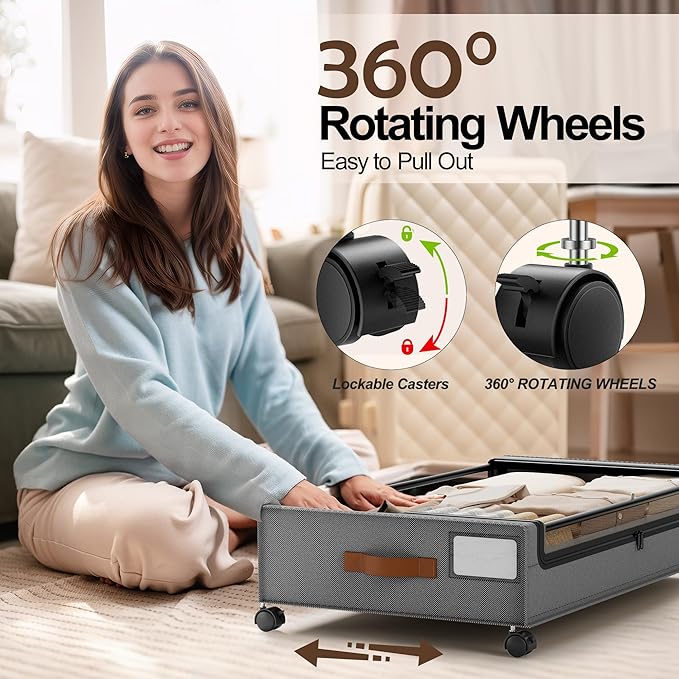 - Smooth & Lockable Wheels: Designed for effortless movement, our under bed storage bins features four 360° silent casters that glide smoothly without damaging floors or carpets. The built-in lock function keeps it securely in place, offering the perfect balance between mobility and stability. No more heavy lifting—just roll it out with ease