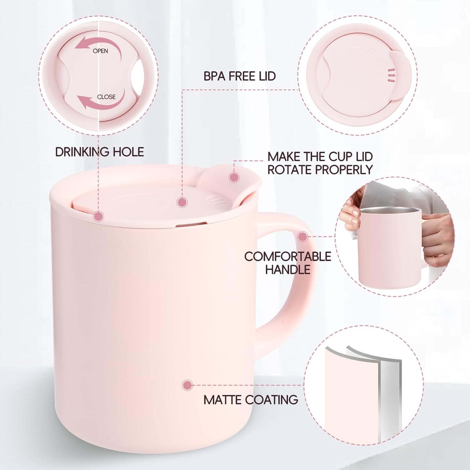 12oz Coffee Mug,Insulated Camping Mug with Lid,Double Wall Stainless Steel Travel Coffee Cup with Handle, Vacuum Reusable Coffee Tumbler Cup for Home, Office, Camping - Pink