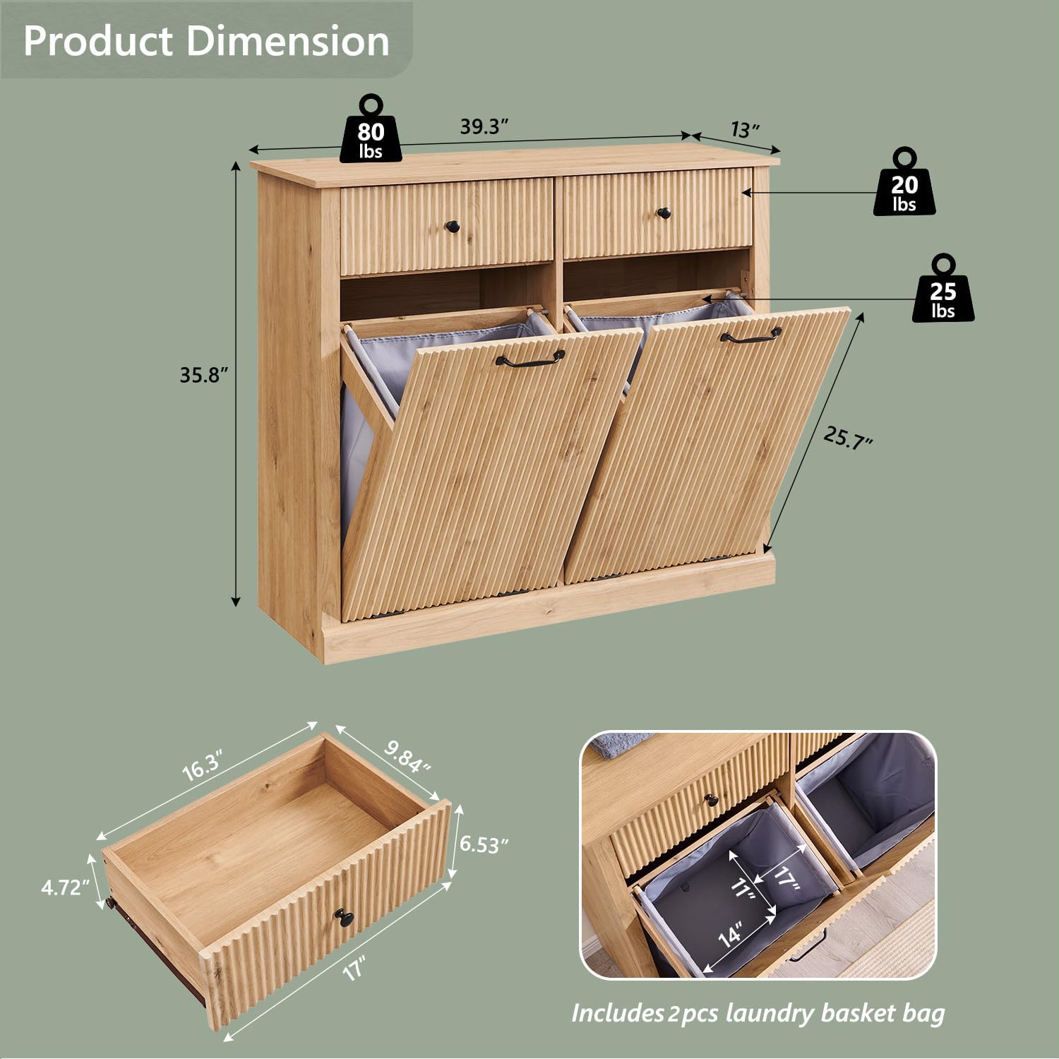 Modern Double Tilt-Out Laundry Hamper Cabinet, 20 Gallon Fluted Trash Can Cabinet with 2 Drawers, Wooden Hidden Garbage Can Cabinets with Laundry Basket, for Bathroom and Kitchen, Natural Oak