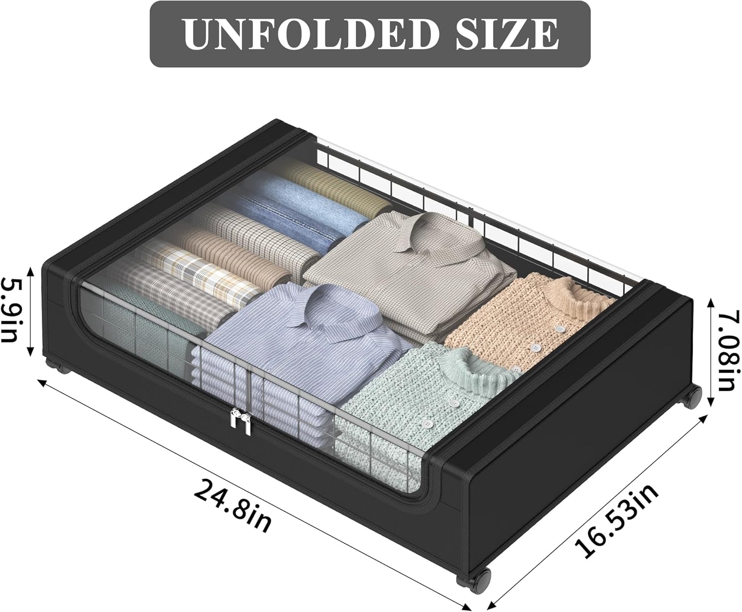 Under Bed Storage with Wheels and Cover, 360° Rolling Under Bed Metal Drawers for Clothes, Blankets, Books and Shoes,Black