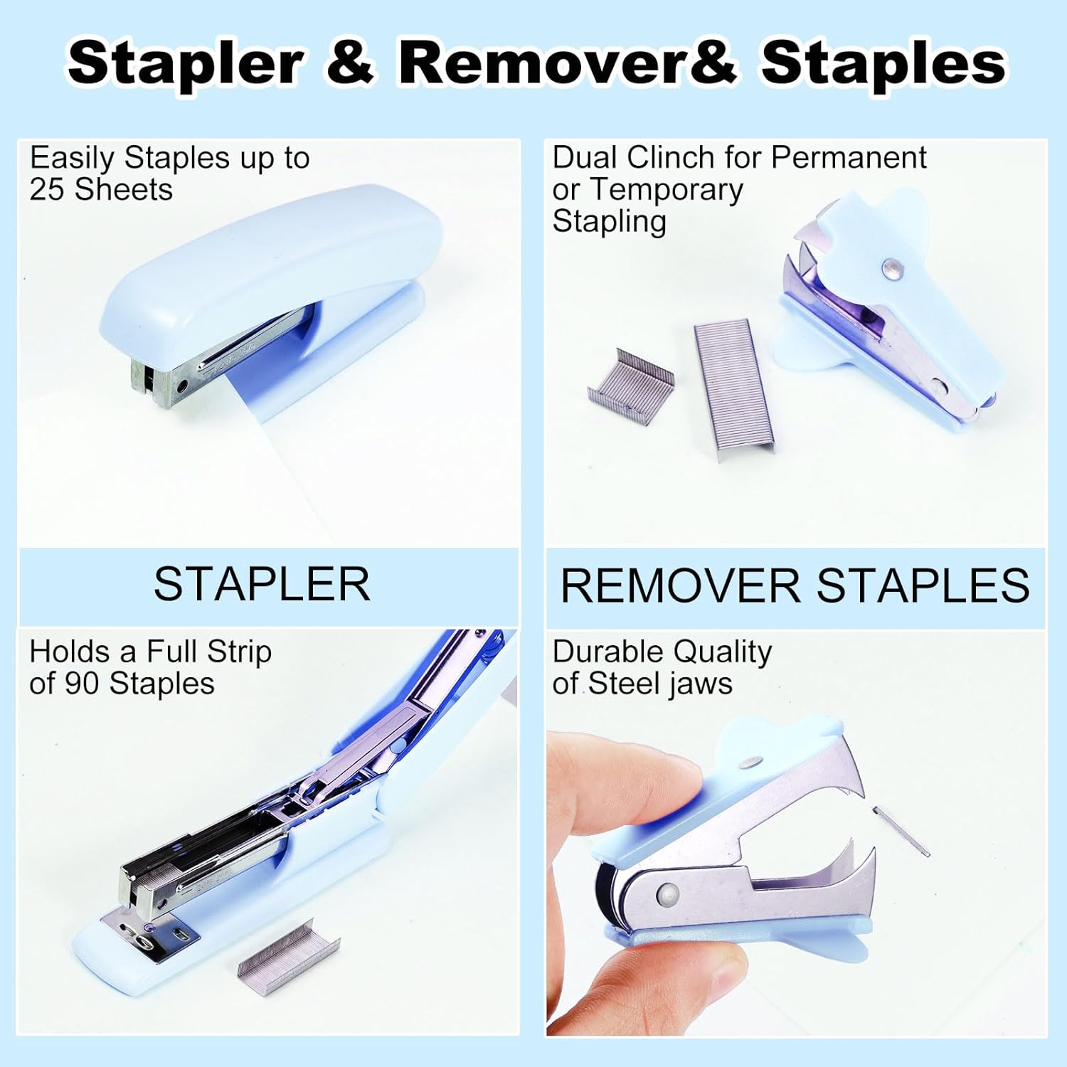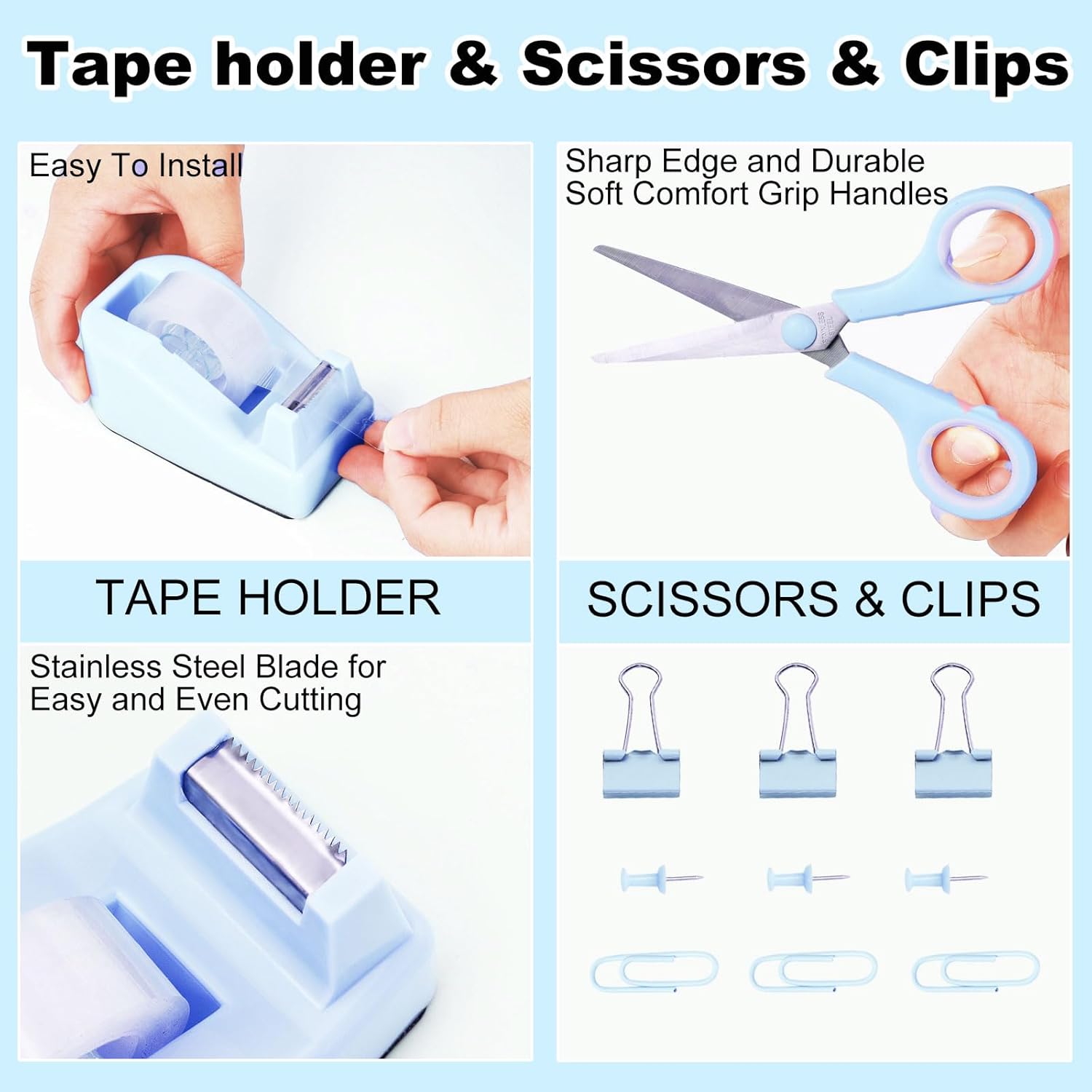 - 【Packing Listing】: 1 x 360-degree rotating pen holder, 1 x tape holder, 1 x stapler, 1 x scissor, 1 x staple remover, 1 x box of binder clips, 1000 x staples, 1 x Pen, 1 x Tape, 1 x Ruler; This blue office set is rich in content and perfect for your desk, improving your productivity and making your office convenient and efficient
