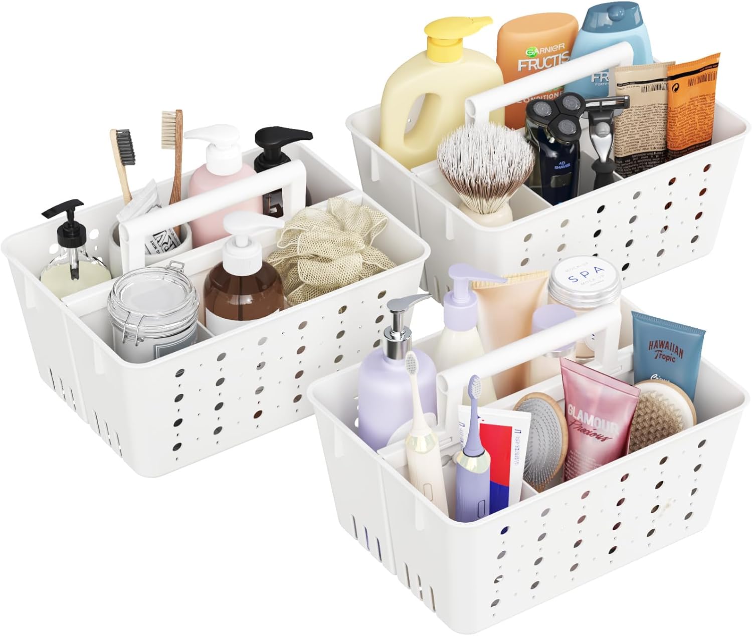 Lifewit Portable Shower Caddy with Handle, 3 Pcs Plastic Shower Caddy Dorm with Holes, Clean Organizer Basket for Bathroom, College, Dorm Room Essentials, White