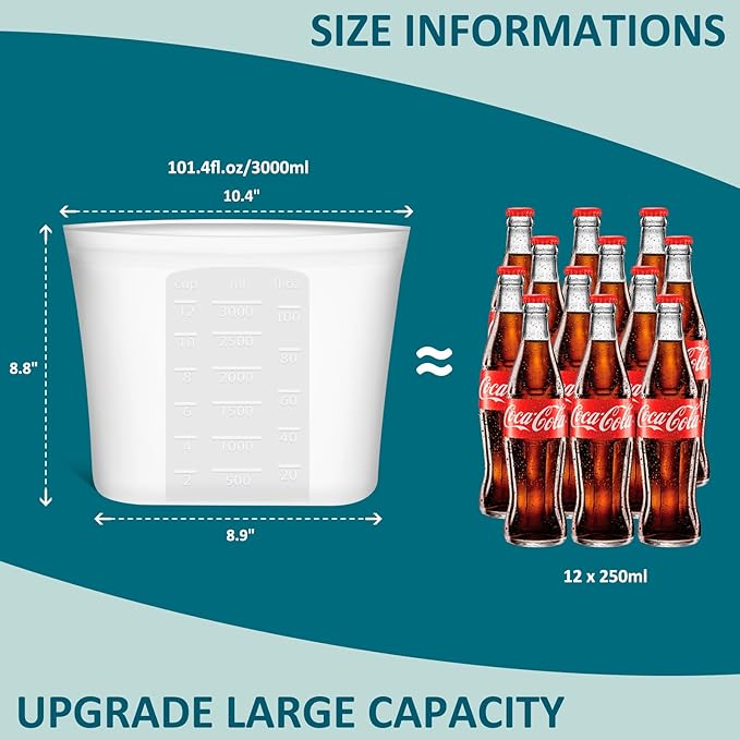 - EXTRA LARGE & COST-EFFECTIVE: Each bag has a large capacity of 0.8 gallon/101 fl.oz/3000 ml, with 4 bags in total. The Extra Large reusable storage silicone bag is ideal for marinating meats, large fruits, or bulk meals. Each bag features volume markings in cups, milliliters, and fluid ounces for easy measurement and the translucent design for content identification. One bag replaces over 300 single-use plastic bags annually, promoting a zero-waste lifestyle