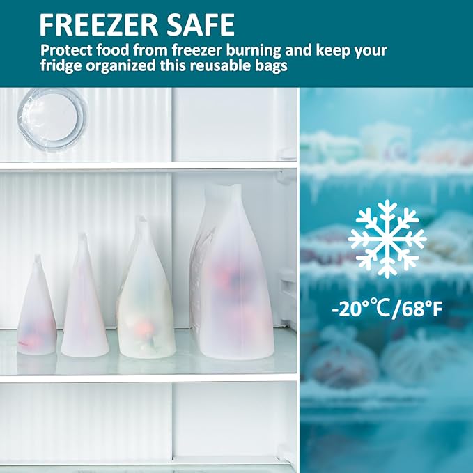 - PURE SILICONE - SAFE & DURABLE: Crafted from 100% food-grade silicone, our reusable ziplock bags are free from PVC, lead, chlorine, phthalates, and BPA. Non-toxic and odorless, they provide a safe storage option for your family’s food. Built to last, these silicone bags feature a thick, durable design for long-term use. Lightweight and easy to handle, they offer a convenient storage solution for everyday needs