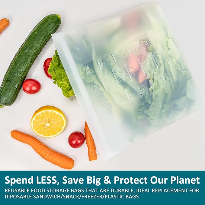 - EXTRA LARGE & COST-EFFECTIVE: This set includes 2 Extra Large (0.8 gallon/3000ml), 2 Large (50.7 fl.oz), 2 Medium (33.8 fl.oz, Quart for Sandwiches), and 2 Small (16.9 fl.oz) Snack silicone reusable bags. The Extra Large size is ideal for marinating meats, fruits, and bulk meals. Each bag features volume markings for easy measurement and a translucent design for content identification. One bag replaces over 300 single-use plastic bags annually, promoting a zero-waste lifestyle