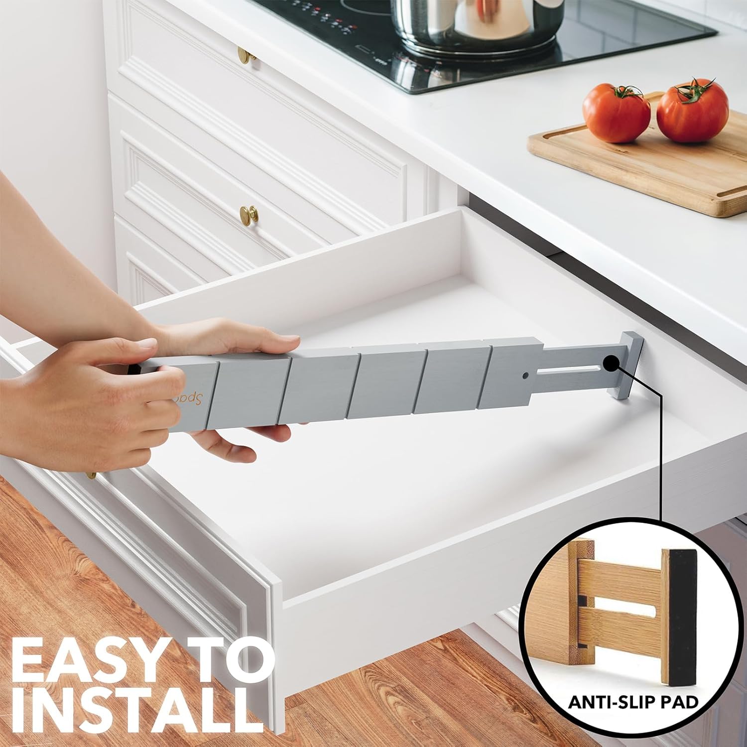 - 7 Gray Drawer Dividers with 15 Inserts: Customize your drawer with our bamboo dividers and inserts; You can organize everything from silverware to utensils. The mini dividers can be easily inserted to make smaller or larger storage parts; LENGTH SIZE: Expandable from 17" to 22" Long