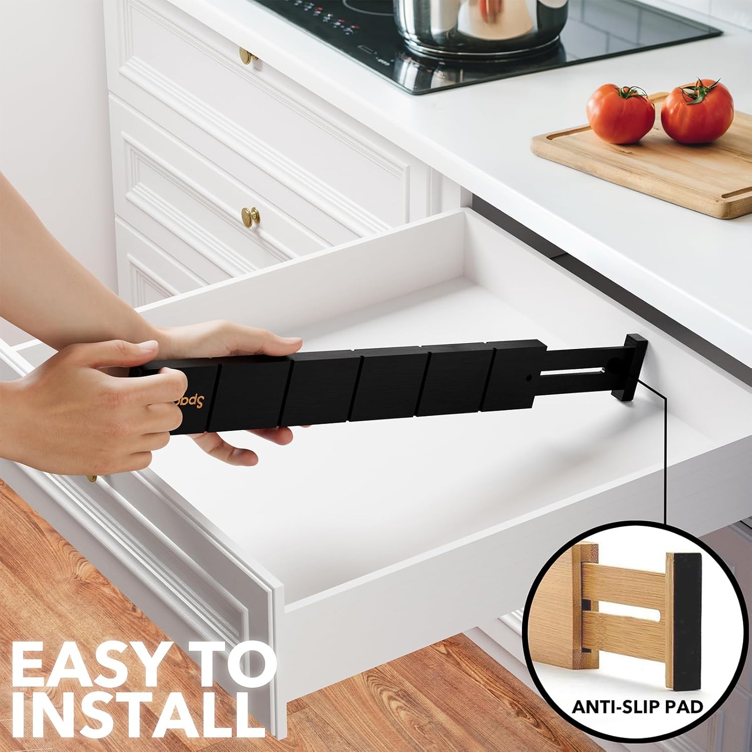 - 7 Black Drawer Dividers with 15 Inserts: Customize your drawer with our bamboo dividers and inserts; You can organize everything from silverware to utensils. The mini dividers can be easily inserted to make smaller or larger storage parts; LENGTH SIZE: Expandable from 17" to 22" Long