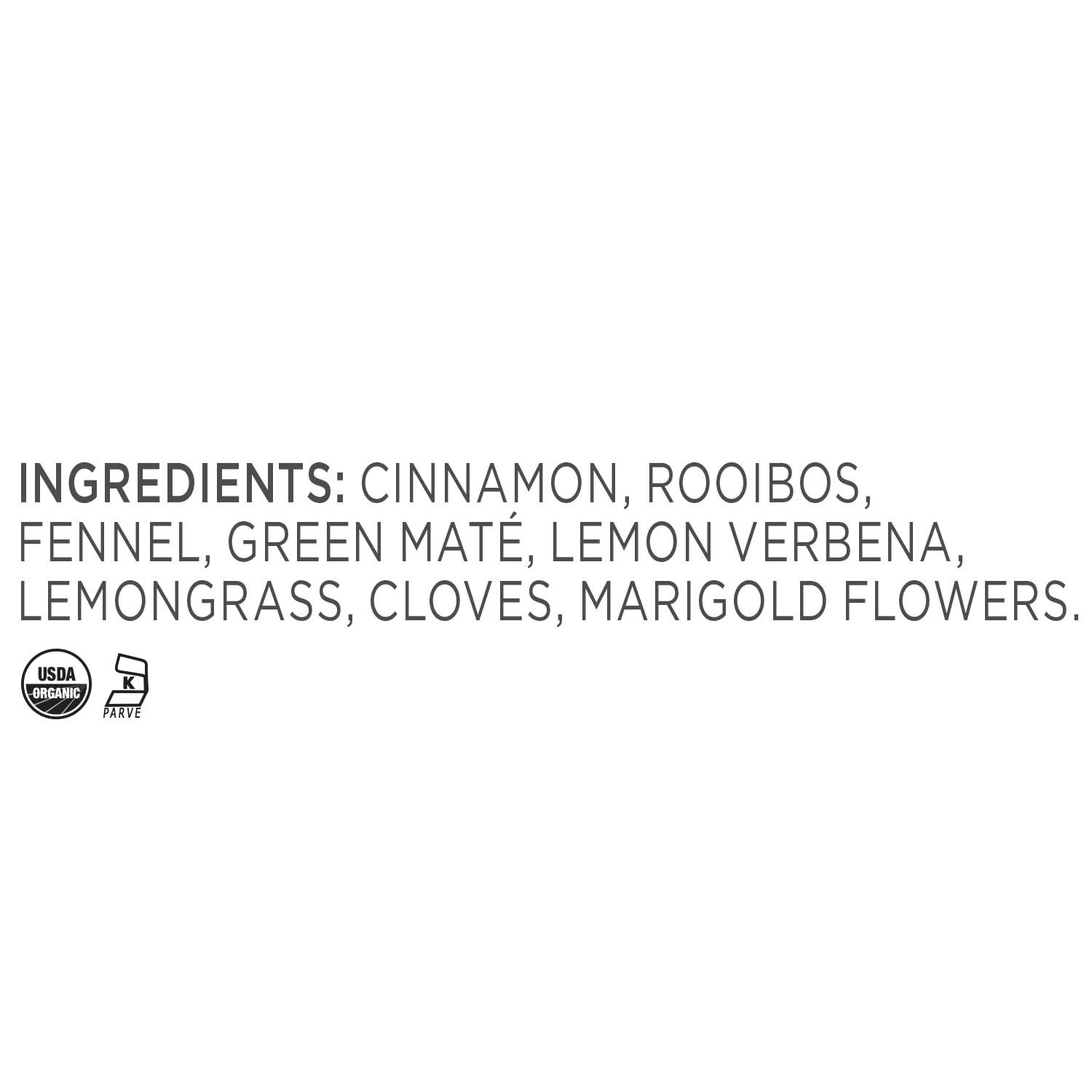 - INGREDIENTS - Cinnamon, rooibos, fennel, green maté, lemon verbena, lemongrass, cloves, and marigold flowers.