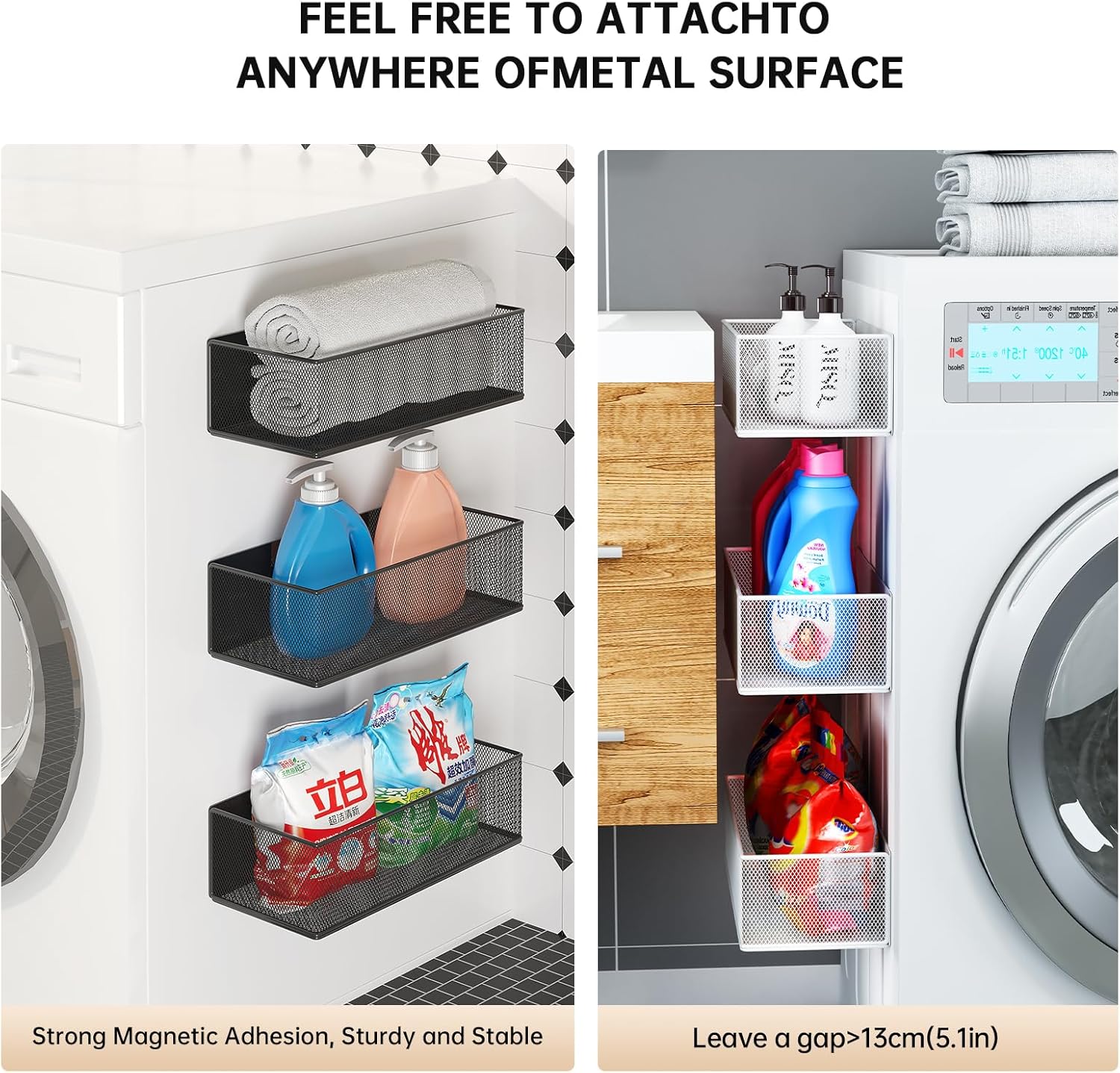 - 【STRONG MAGNETIC ADHESION】- Our magnetic shelves for washing machine have a widened magnet attached on the back of basket organizer and with strong magnetic force, which can support up to 16 lbs. It would not gradually slide down over the washing machine. It can be firmly adsorbed by only touching the surface of the metal surfaces and won’t rust.