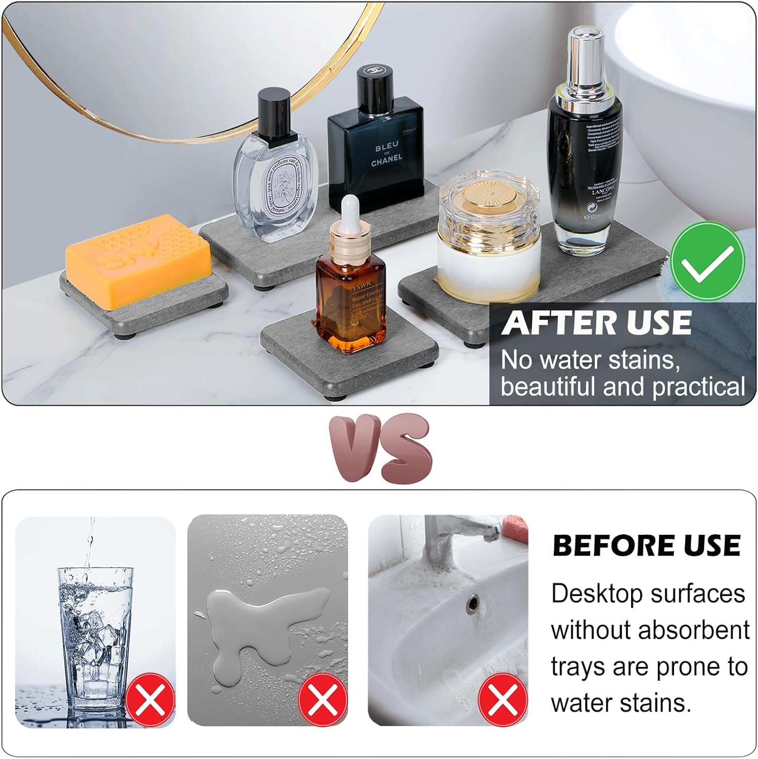 - More Anti Slip and Ventilated --- The silicone footpads boost the slip-resistance of absorbent stone coasters while keeping them out of the bathroom vanity. This design improves the contact surface between diatomaceous earth coasters and air, accelerates the evaporation of water, and extends the service life of the water absorbing stone tray for sink.