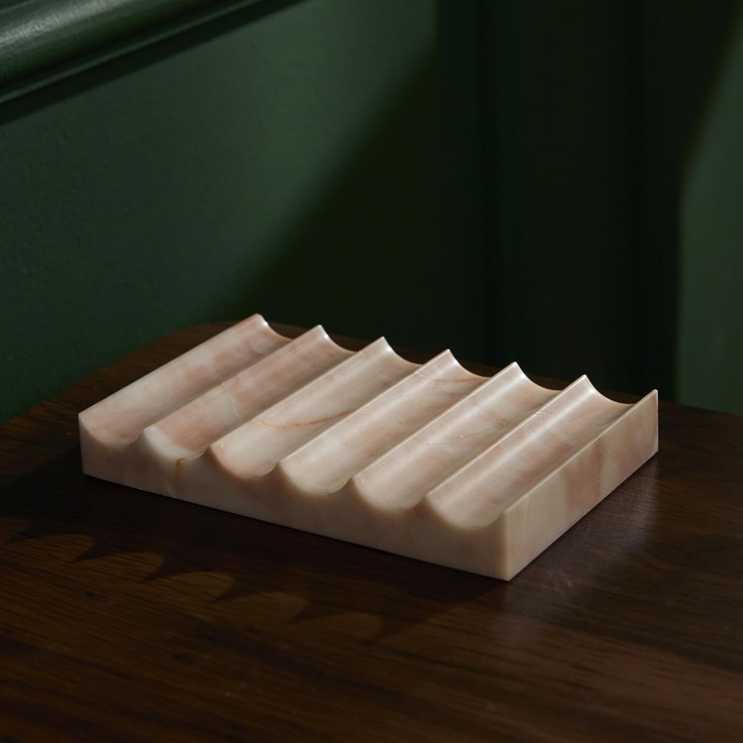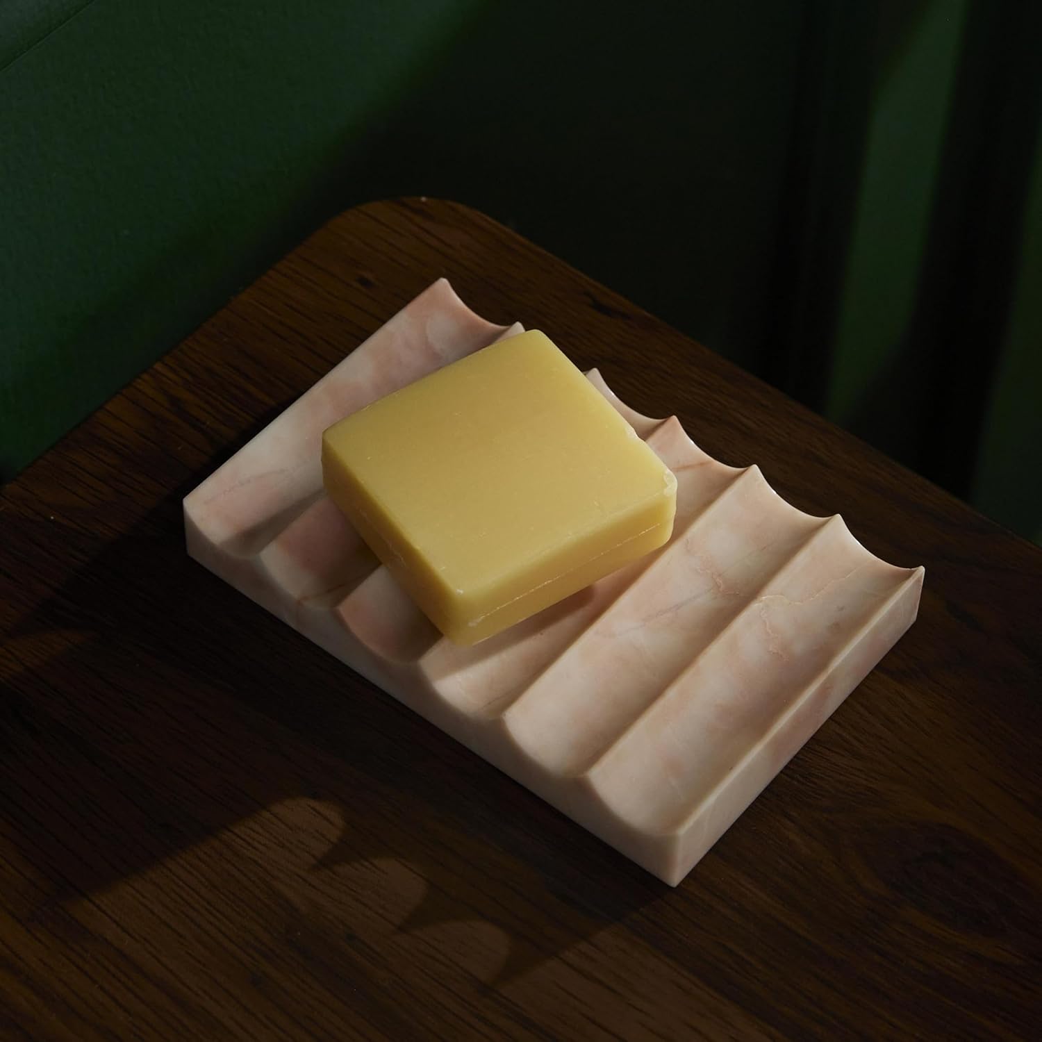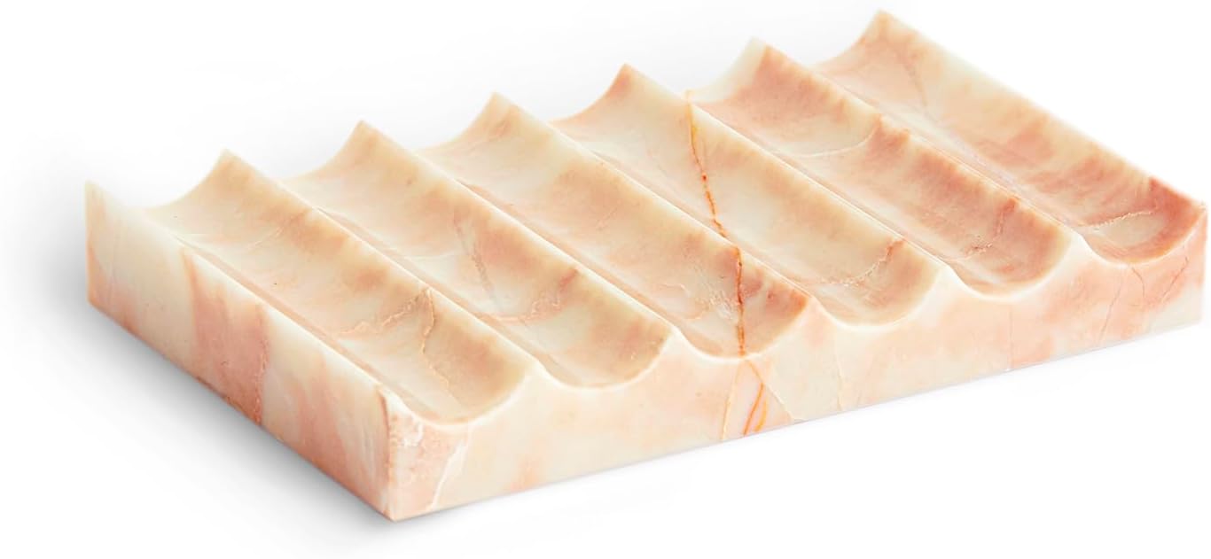 Luxurious Marble Soap Dish Jewelry Ring Tray - Rectangle Stone Soap Tray & Saver for Shower – Self Draining Soap Holder for Bathroom, Kitchen, Beige Travertine (Pink/Cream Rose)