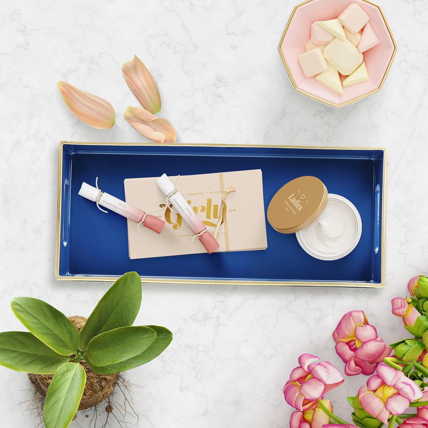 Blue Bathroom Vanity Tray for Countertop, Small Plastic Toilet Tank Versatile Storage & Organization Tray for Makeup, Perfume, Desk, Kitchen, Candles, 13.7"x6"x1.4", 35HB
