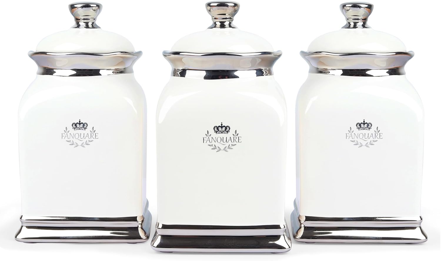 fanquare 30 OZ Cookie Jar, White Kitchen Canisters Set of 3, Farmhouse Porcelain Decorative Jars for Countertop, Ceramic Storage Jar for Coffee, Sugar, Tea Bag