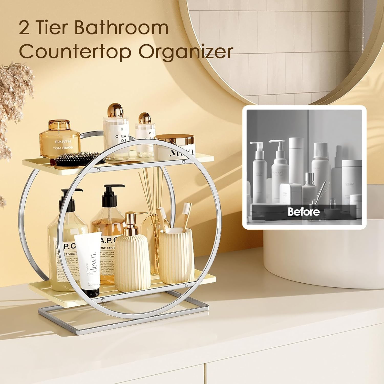 - 【Elegant Round Design for a Refined Look:】Featuring a refined circular shape, this shelf adds a touch of elegance to your bathroom decor. Its sleek lines and smooth curves create a visually appealing focal point, making it a stylish addition to any countertop space. (Silver Frame and Cream White Tray)
