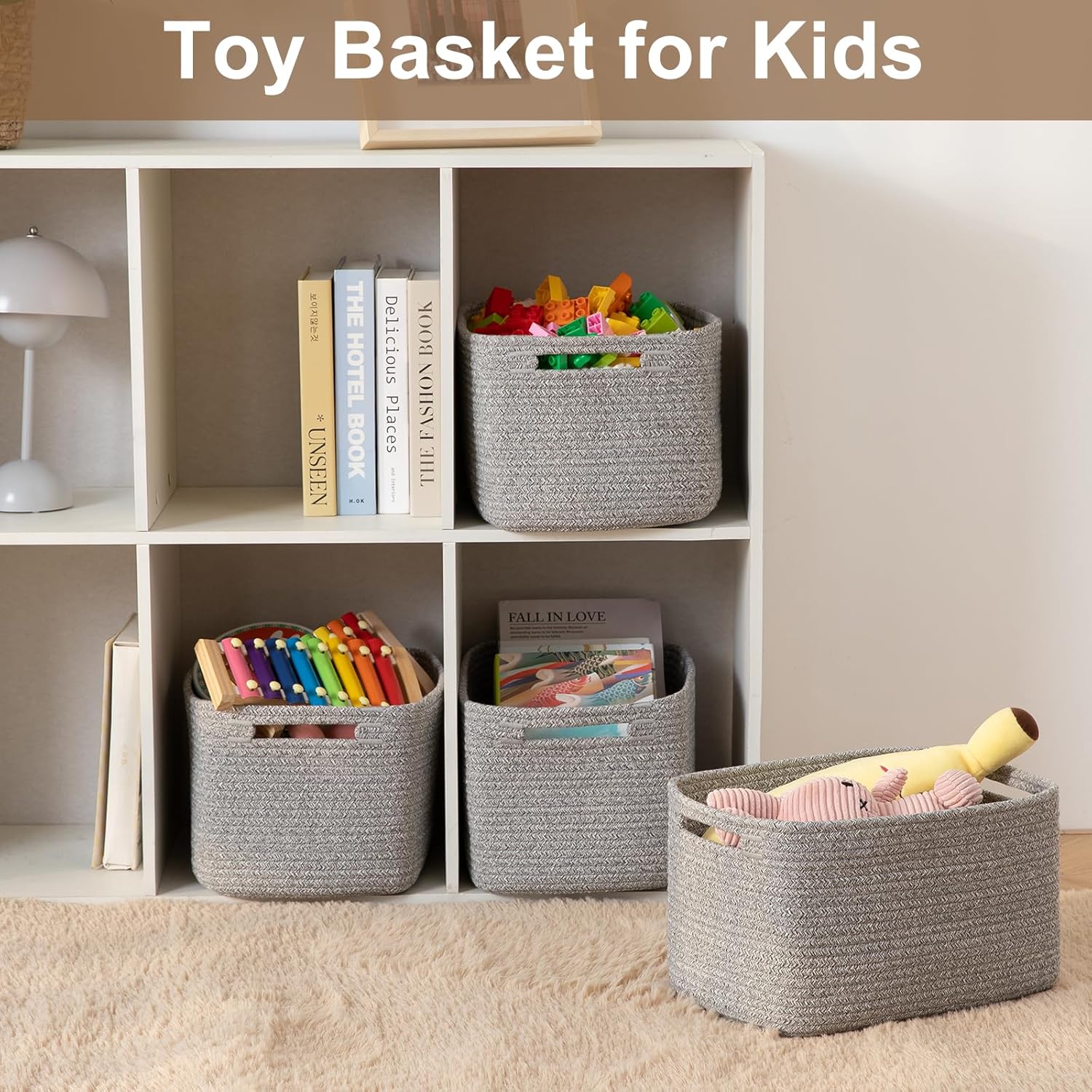 Storage Baskets for Organizing, Woven Decorative Baskets for Shelves - Books, Towels, and Clothes, Cotton Rope Toy Storage Bins, 12.7''Lx9''Wx7.8''H, Pack of 4, Grey