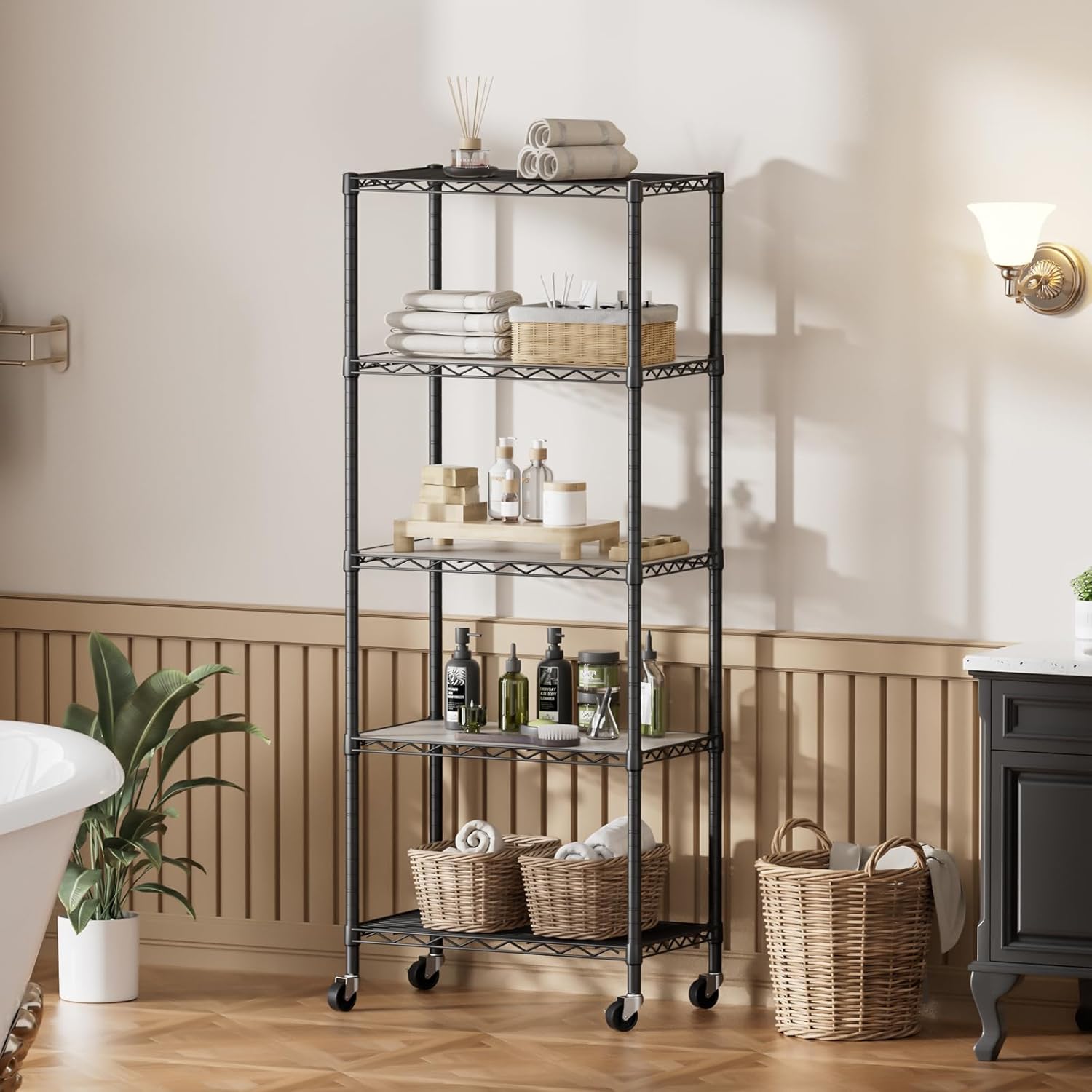 SINGAYE 5 Shelves Storage Shelf Wire Closet Bathroom Organizers Metal Pantry Kitchen Garage Shelving Unit Laundry Room Organization Home Rack Net Basket Black with Wheels