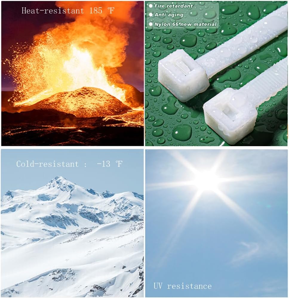 - High quality nylon zip ties PA66 material: These zip ties have fire-resistant and flame-retardant properties, designed specifically for harsh environments, and can withstand temperatures ranging from -25 ℃ to 85 ℃ (-13 ℉ to 185 ℉). They have excellent strength, durability, acid resistance, corrosion resistance, and wear resistance.