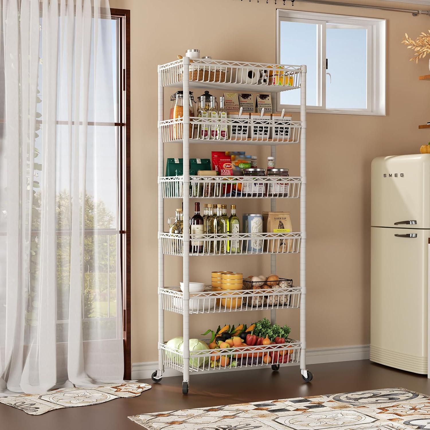 SINGAYE 6 Tier Big Basket Shelf Wire Shelving Unit Adjustable Storage Shelves Rack for Garage Kitchen Office Pantry Corner Metal with Wheels White