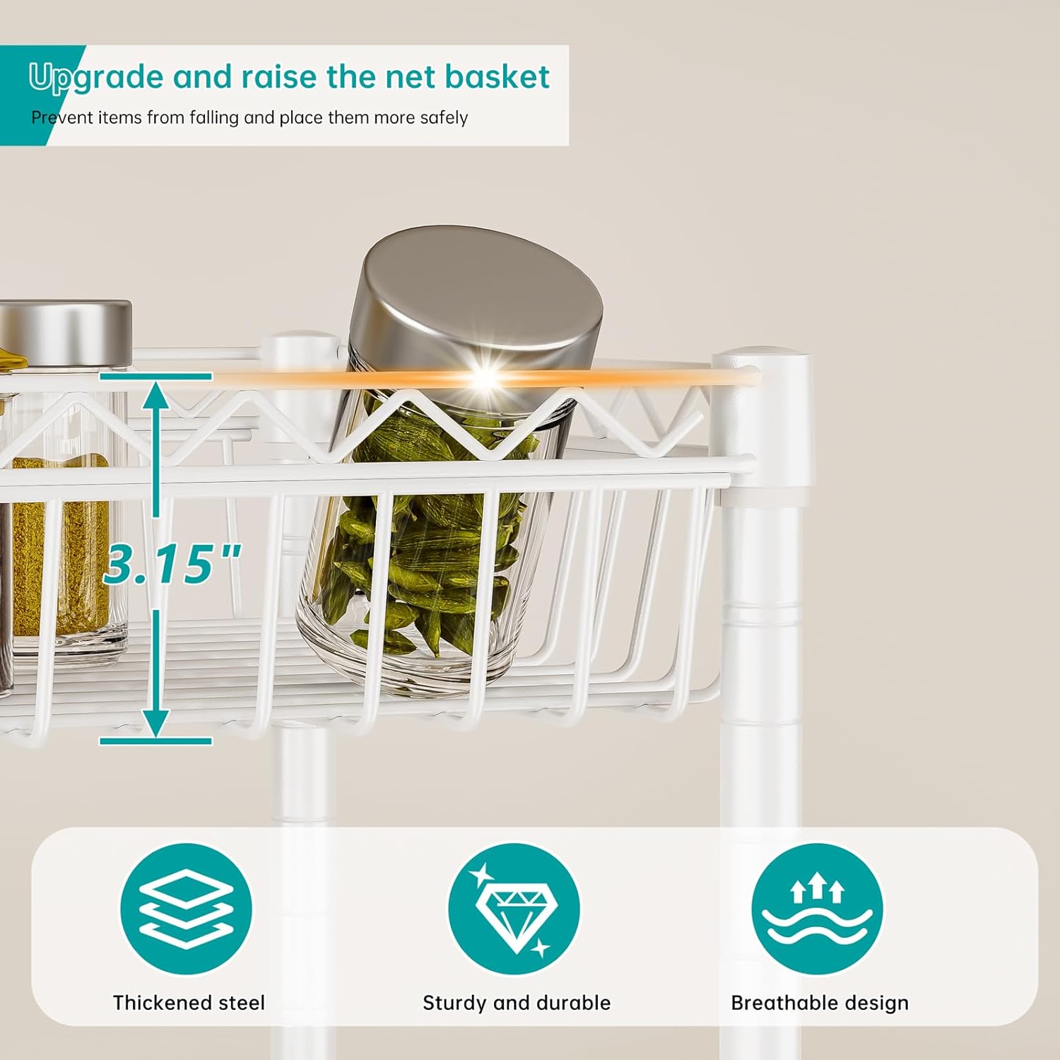 - Features: This shelf is designed with metal mesh baskets to prevent items from falling, each layer height is adjustable to accommodate items of different sizes, and it with wheels for easy mobility.