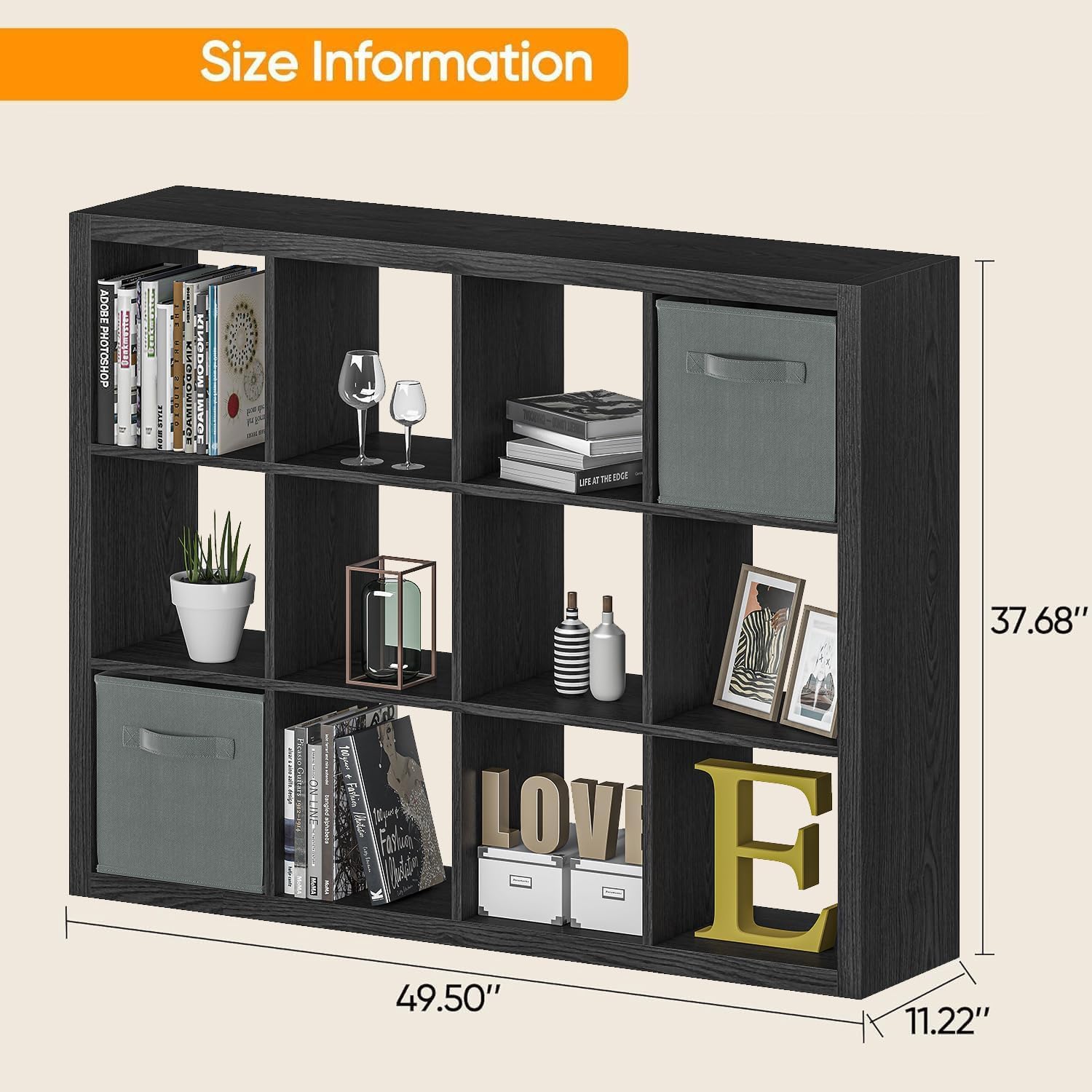 Bookshelf with Storage Bin, 12-Cube Storage Organizer, Modern Wood Open Bookcase, Multifunctional Display Shelf for Living Room, Bedroom, Home Office, Black