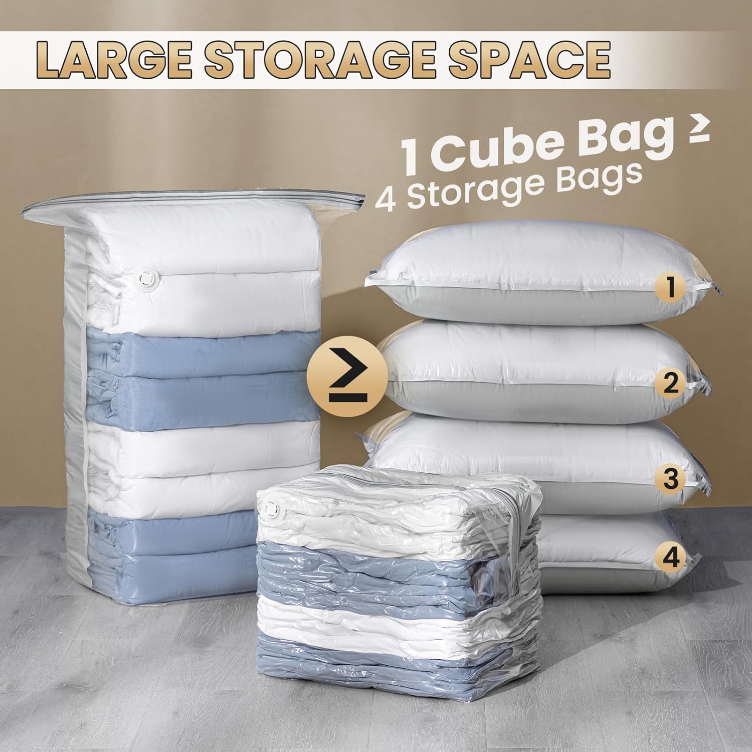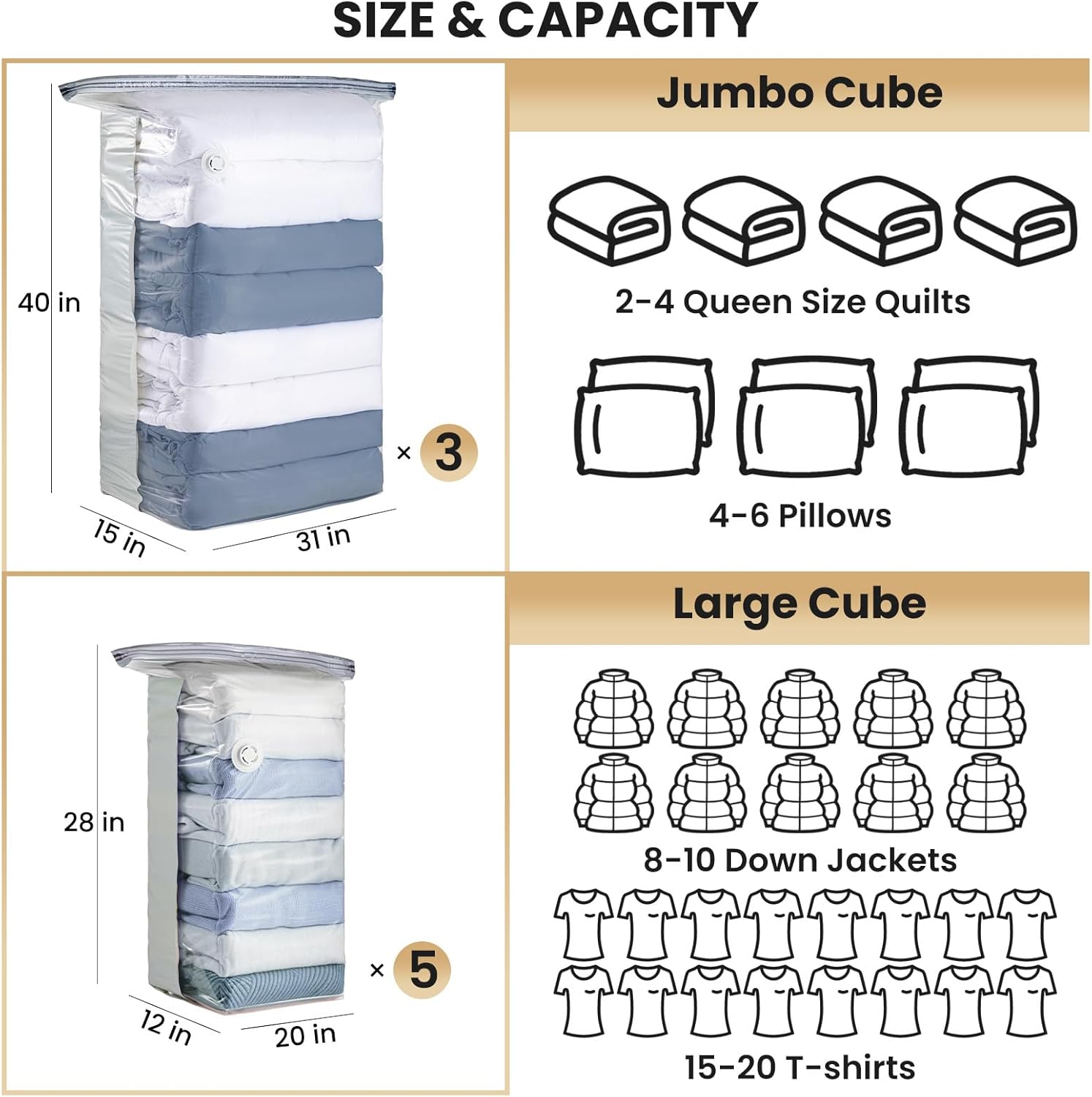 - Save More Space & Time: Our cube vacuum bags have trapezoidal three-dimensional structure. With an expandable bottom is easier to place when storing clothes, and the storage capacity of vacuum storage bags for comforters and blankets is larger. Easily release space in seconds and larger capacity allows you to pack more things at one time