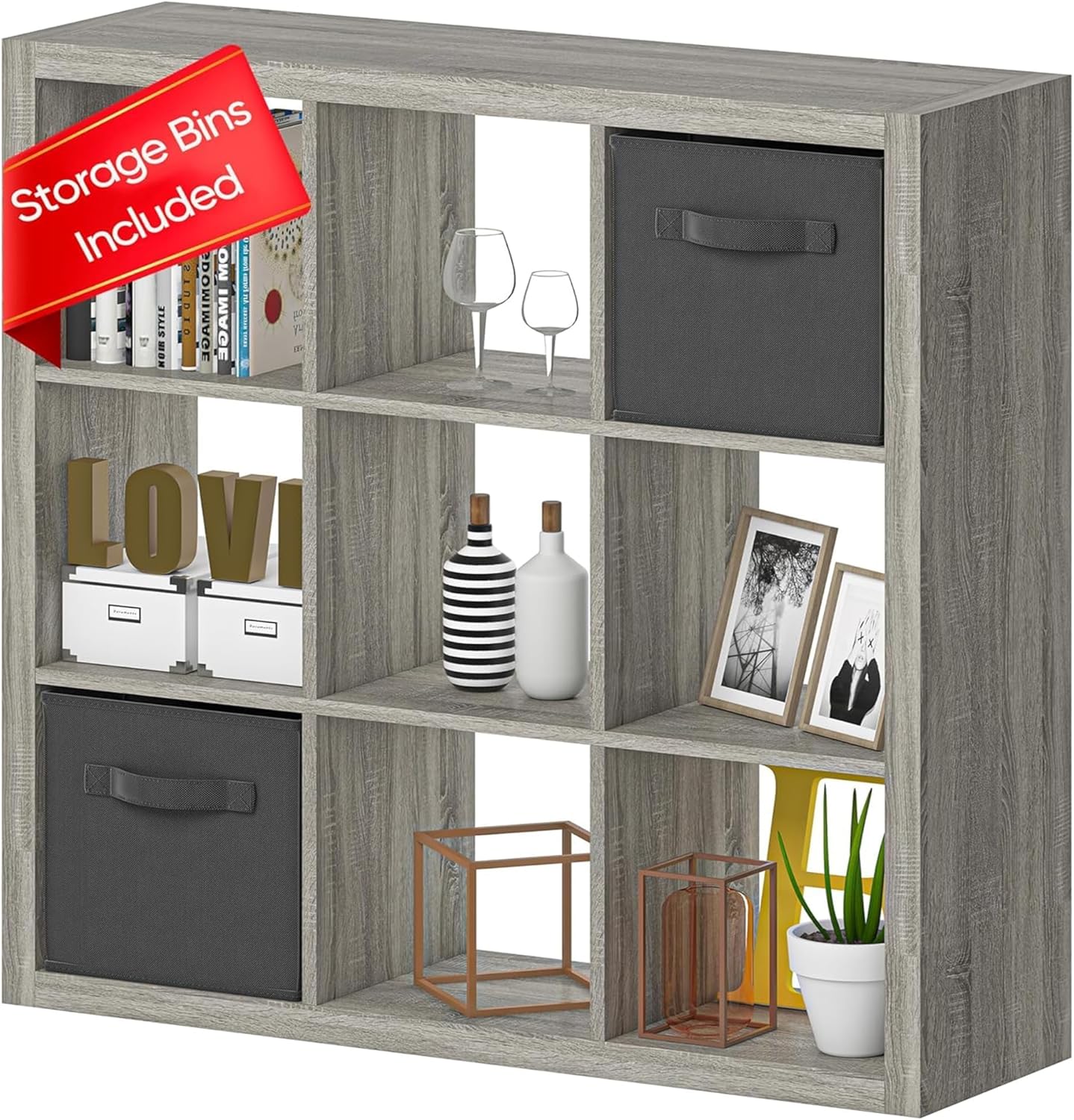 Bookshelf with Storage Bins, 9-Cube Storage Organizer Sturdy Wooden Bookcase Open Book Shelf, Multifunctional Cubicle Rack for Storage & Display, Furniture for Living Room Bedroom Office, Gray Oak