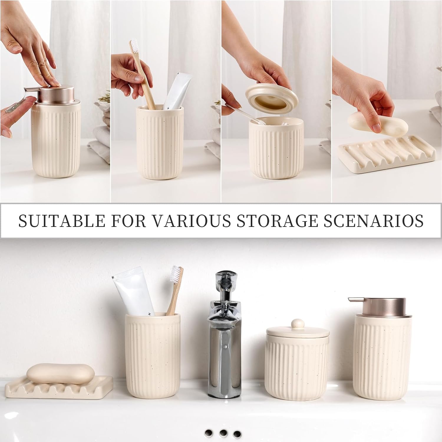 - Space-Saving Design: This bathroom set accessories each piece in the set is thoughtfully designed to optimize your bathroom countertop space, keeping it neat and organized. Handy & easy-to-use around the house.