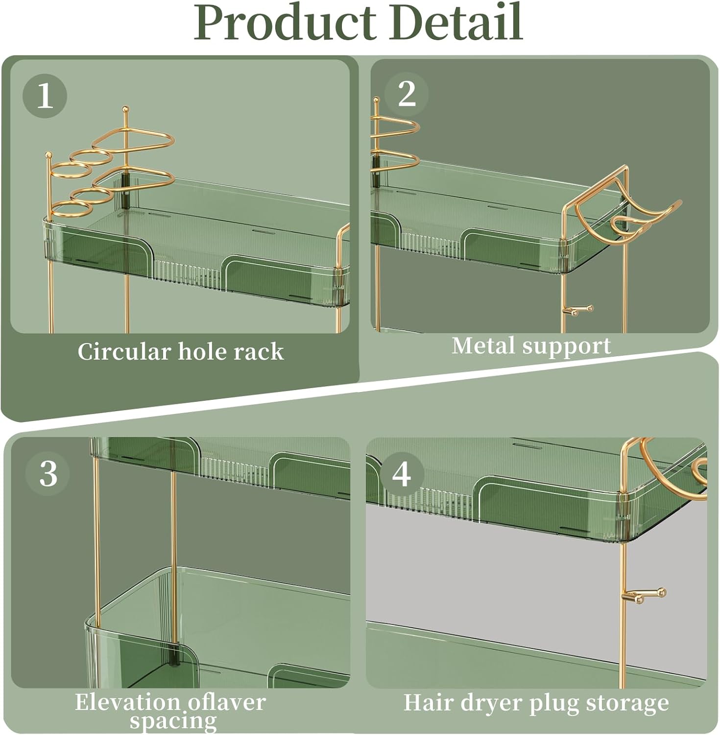 3 Tier Bathroom Organizer Countertop Makeup Perfume Tray Skincare Organizer Comes with Hair Dryer Rack and Toothbrush Holder for Bathroom Dresser Vanity (Green)