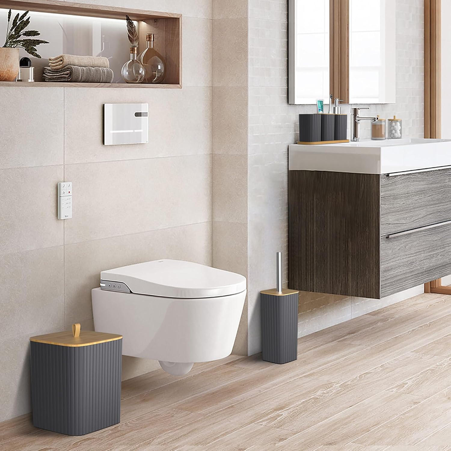 - POWERFUL FUNCTIONALITY –①9L large-capacity trash can with lift-off lid.②Toilet brush with cover, keeps water off your hands.③The tray holds toothbrush holder, tumbler, and soap dispenser for easy organization.④Cotton swab box neatly stores cotton balls, swabs, and floss picks, keeping essentials tidy.⑤3-hole toothbrush holder separates toothbrushes and toothpaste for a clean and hygienic setup.⑥Soap dispenser ensures easy and mess-free access to liquid soap, enhancing convenience.