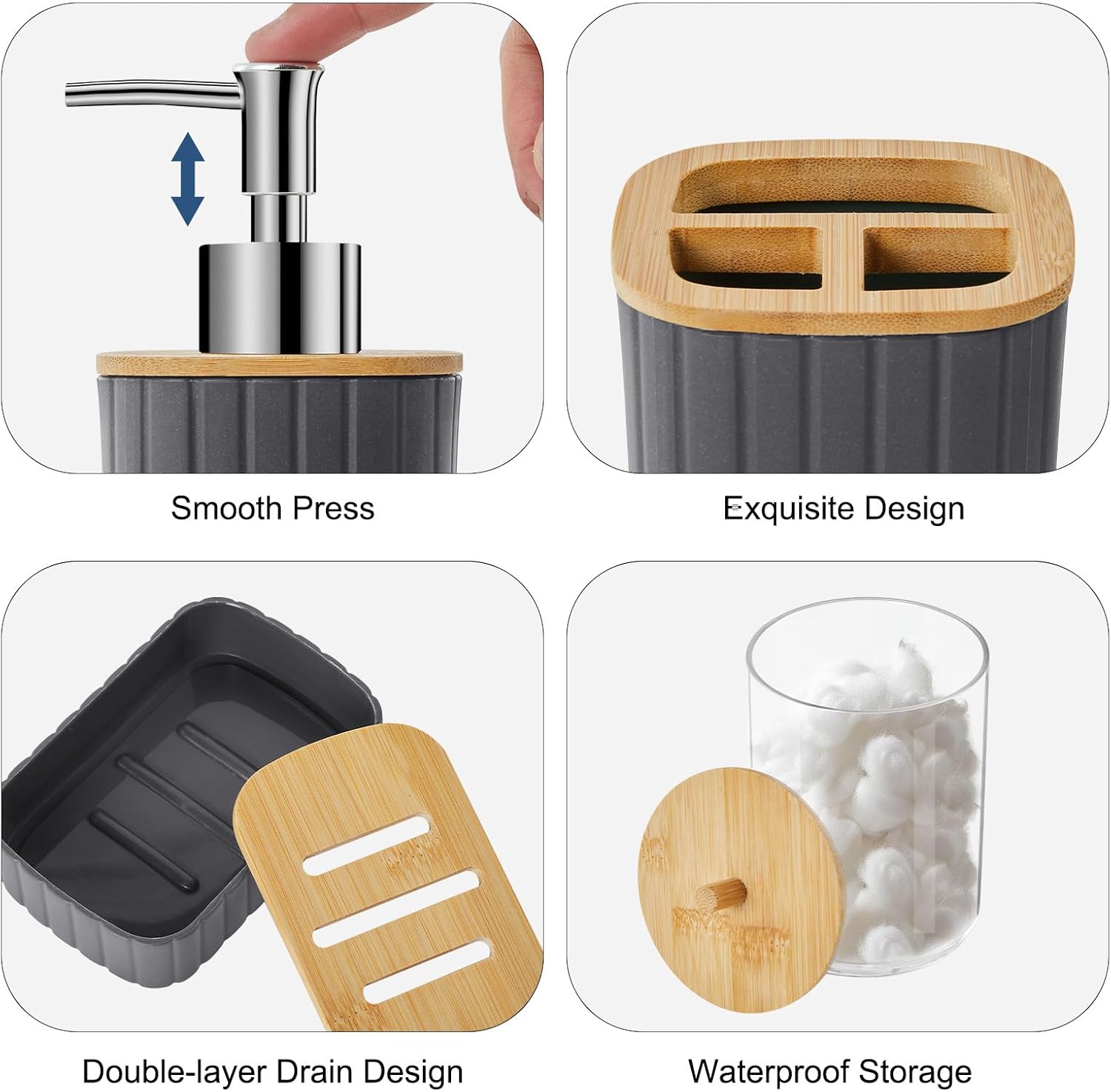 - COMPLETE 22-PIECE BATHROOM SET – This bathroom accessory set includes a jacquard shower curtain, a toilet brush and holder set, a trash can, 2 cotton swab boxes, a tumbler, a soap dish, a toothbrush holder, a soap dispenser, a tray, and 12 metal shower curtain hooks. Everything you need to transform your bathroom into a stylish, functional, and perfectly organized space. Tip: Keep wooden parts dry, avoid soaking, and store in a dry place to avoid mold.
