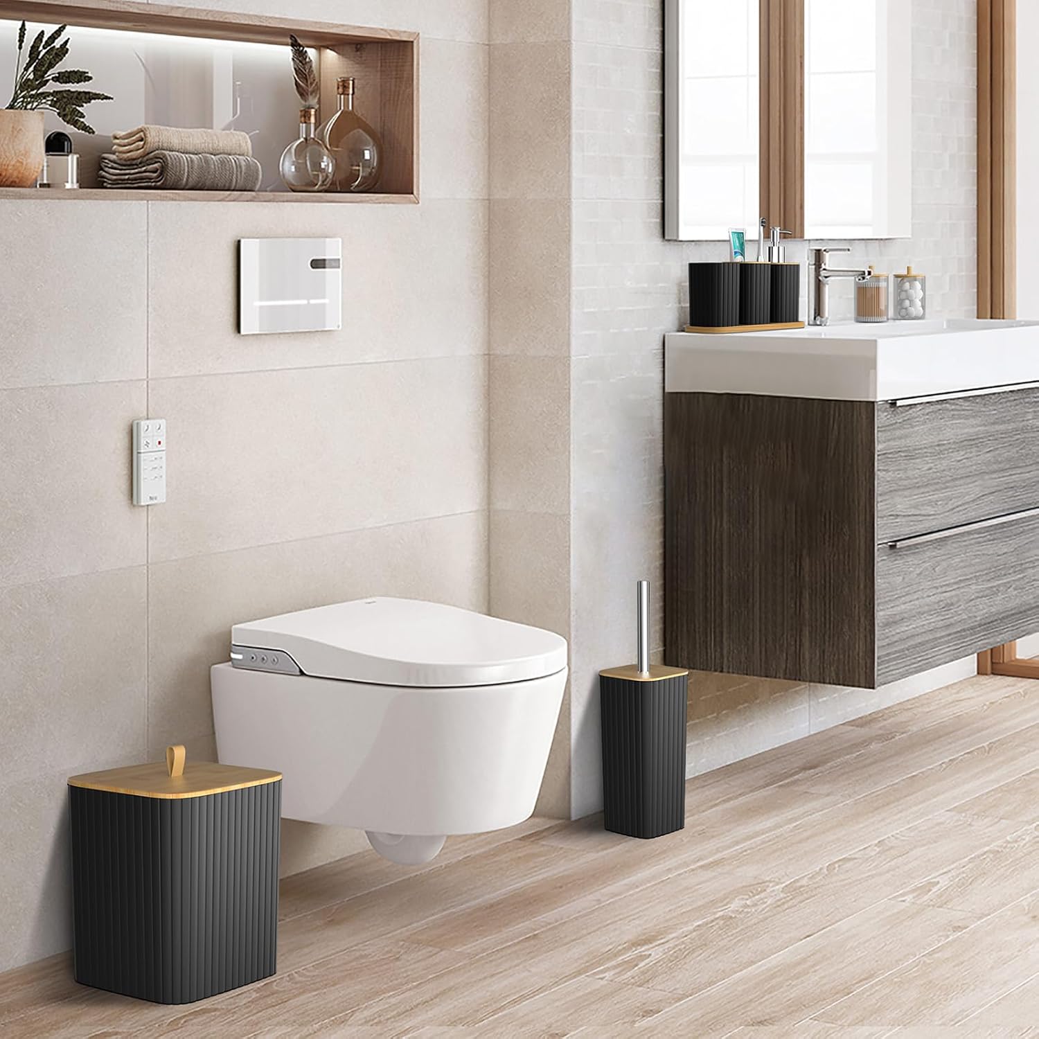 - COMPLETE 22-PIECE BATHROOM SET – This black bathroom set includes a jacquard shower curtain, a toilet brush and holder set, a trash can, 2 cotton swab boxes, a tumbler, a soap dish, a toothbrush holder, a soap dispenser, a tray, and 12 metal shower curtain hooks. Everything you need to transform your bathroom into a stylish, functional, and perfectly organized space. Tip: Keep wooden parts dry, avoid soaking, and store in a dry place to avoid mold.