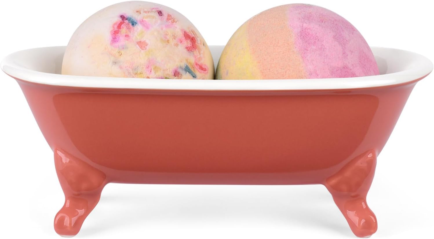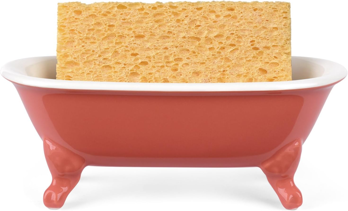 6.5" Ceramic Mini Decorative Clawfoot Bathtub Bar Soap Dish, Kitchen Sponge Holder and Shower Tray for Bathroom, 1 Pack(Coral)
