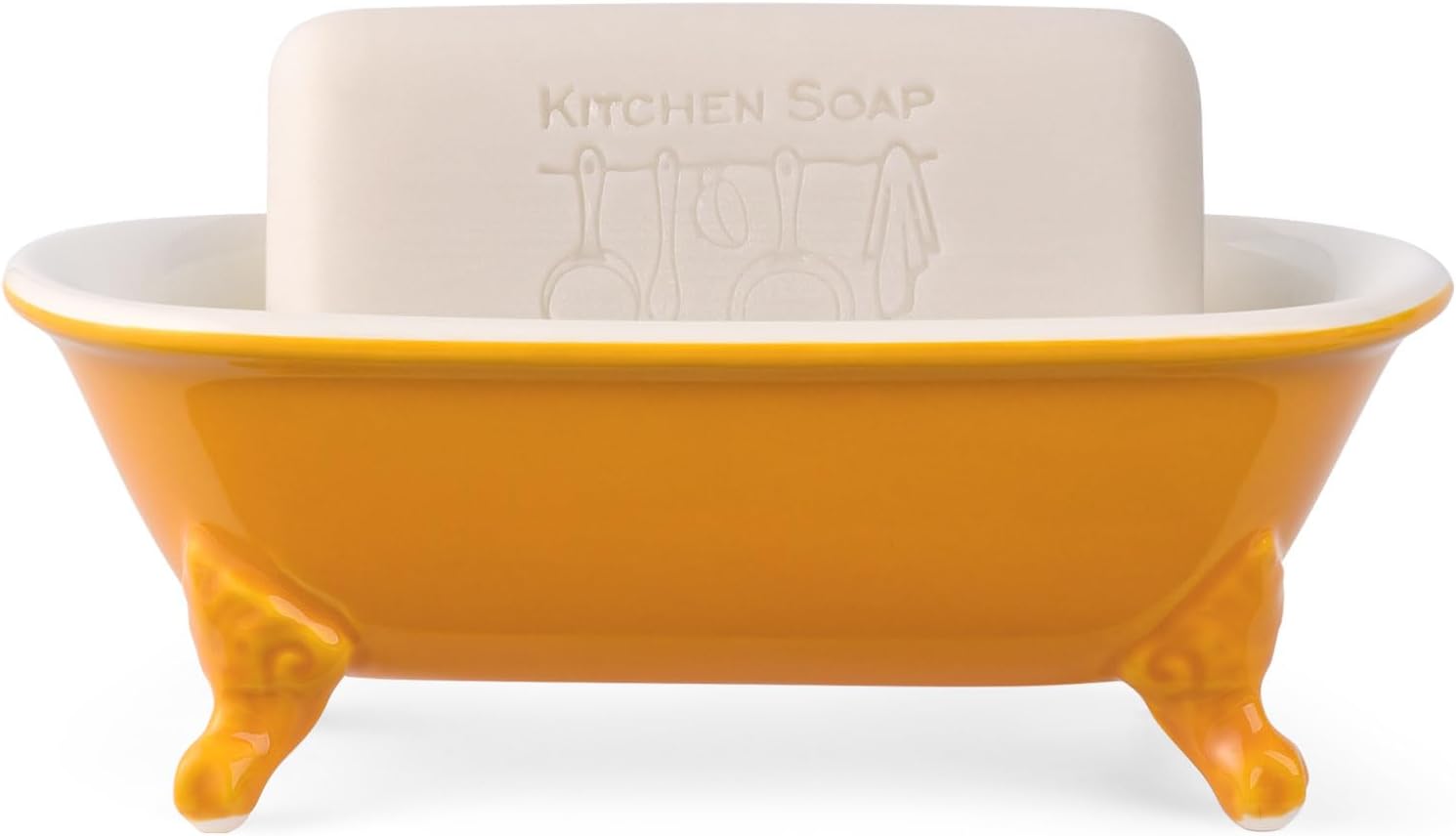 - Style: This ceramic soap dish is inspired by a vintage claw-foot bathtub and features a distressed white modern finish with two tone colors. this soap dish will fit perfectly in any bathroom sink or kitchen countertop.