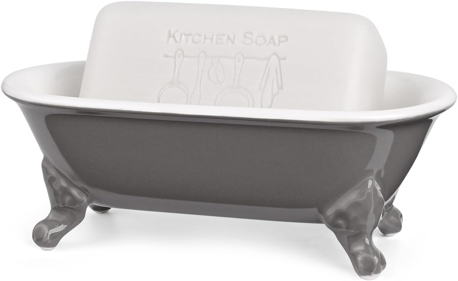 - Style: This ceramic soap dish is inspired by a vintage claw-foot bathtub and features a distressed white modern finish with two tone colors. this soap dish will fit perfectly in any bathroom sink or kitchen countertop.