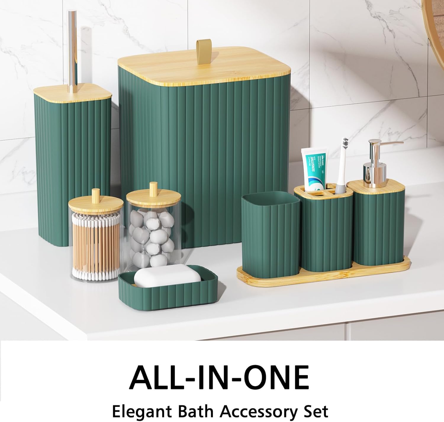 - COMPLETE 22-PIECE BATHROOM SET – This bathroom accessory set includes a jacquard shower curtain, a toilet brush and holder set, a trash can, 2 cotton swab boxes, a tumbler, a soap dish, a toothbrush holder, a soap dispenser, a tray, and 12 metal shower curtain hooks. Everything you need to transform your bathroom into a stylish, functional, and perfectly organized space. Tip: Keep wooden parts dry, avoid soaking, and store in a dry place to avoid mold.