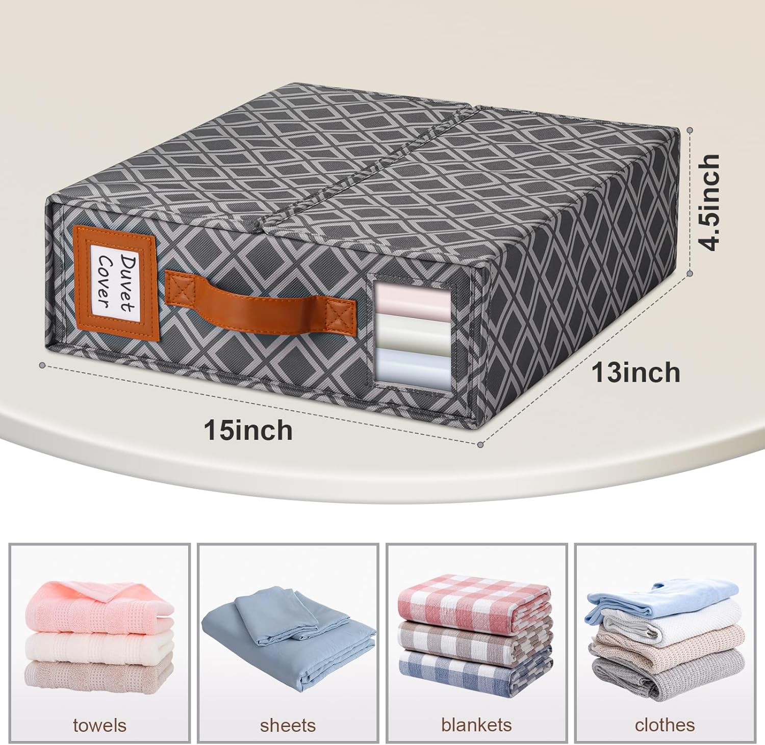 - 【Large Capacity】Our sheet storage box measure 15 in x 13 in x 4.5 in, it can effortlessly holds complete queen or king bed sheet set, 1 duvet cover and 2 pillowcases. The foldable design allows the bed sheet storage organizer to be folded when not used