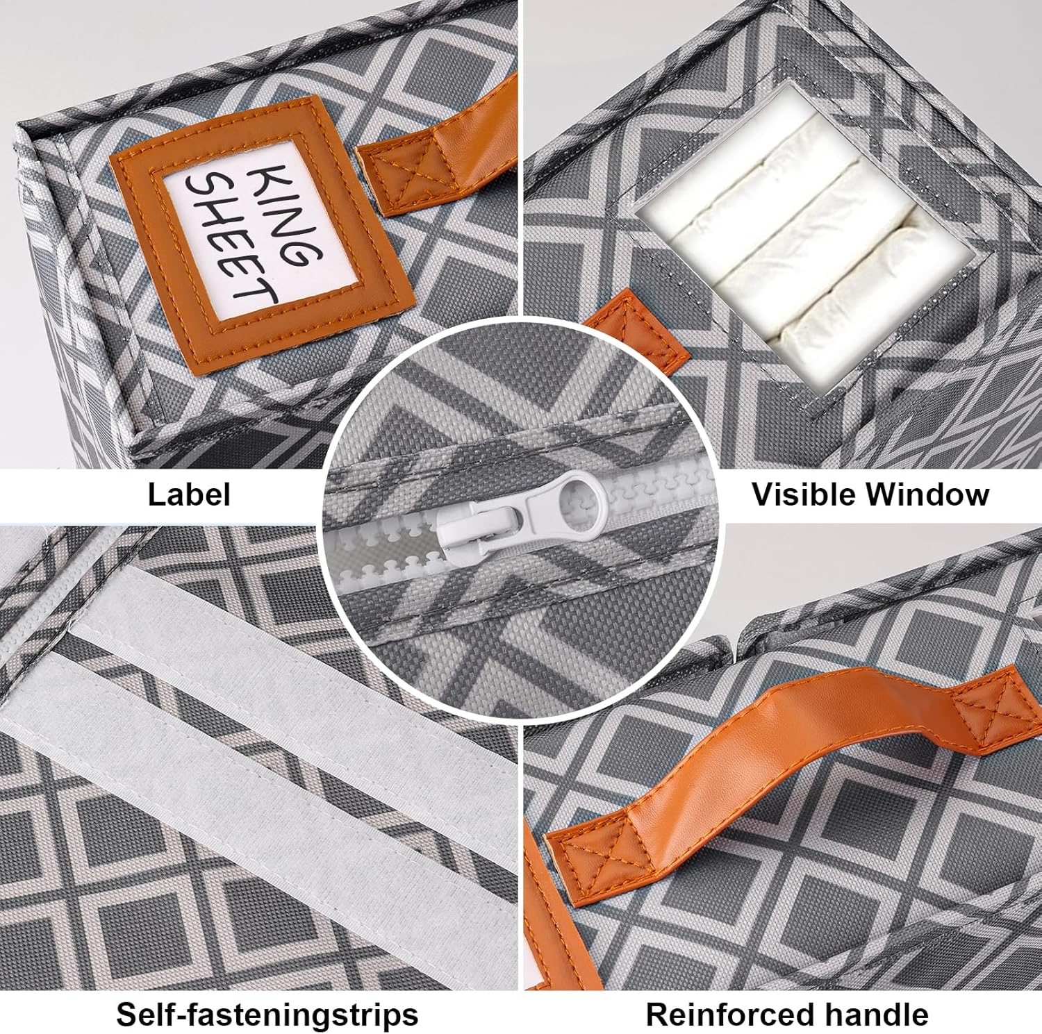 - 【Sturdy Fabric】Our sheet storage organizer has a sturdy structure, will not collapse or deform even under compression and stacking. Bed sheet storage with full sealed features provides optimal protection and protects your bedding from dust, moisture and pet hair