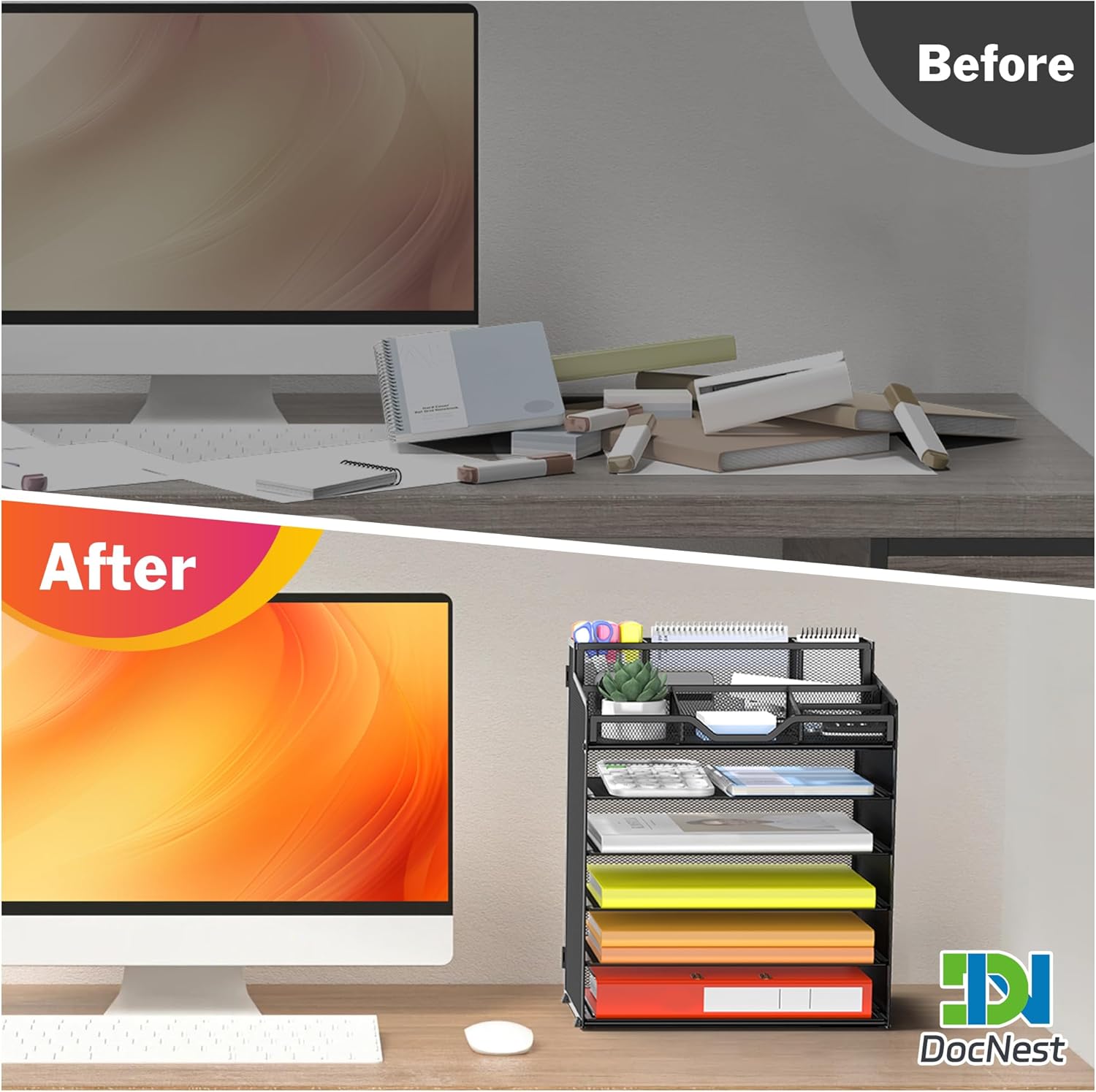 - Maximize Your Workspace Efficiency: Upgrade your office organization with the DocNest 6-tier paper letter tray organizer. This multi-functional desk organizer is designed to keep your documents, papers, and office supplies neatly sorted and easily accessible. With 5 adjustable compartments, you can customize the space to fit your needs, whether it's for files, stationery, or other essentials