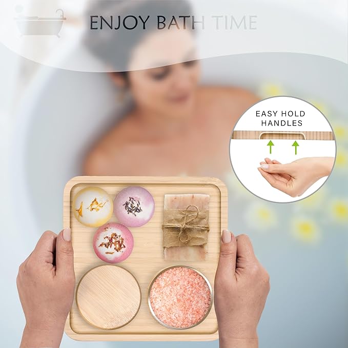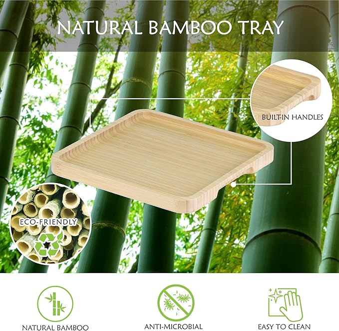 - Cute Vanity Tray: The qtip holder bathroom set comes with a bamboo tray; keeps the set together and adds a touch of warmth to your space. By 7.5" * 7.5", great to hold the glass bathroom jars, candles, perfume bottles, cosmetics, keys, charge, etc.
