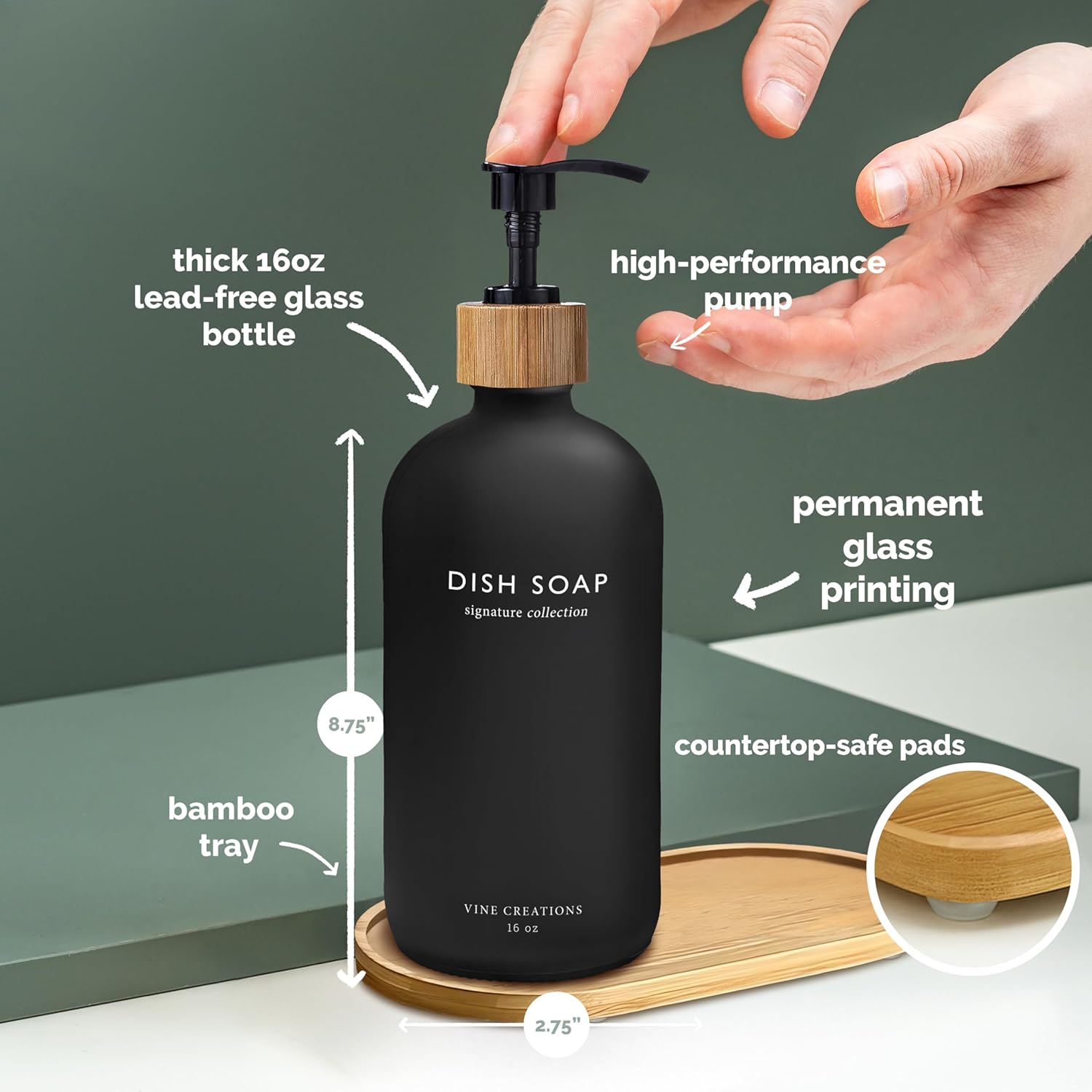 Vine Creations Black Glass Soap Dispenser Set, Hand Soap and Dish Soap Dispenser Set with Bamboo Tray, 16 oz Glass Dispensers Bottle for Kitchen and Bathroom Decor Modern Boho with Bamboo Pump (Black)
