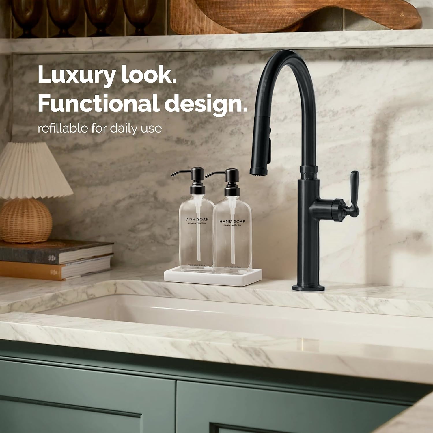 - STYLE YOU CAN FEEL – Heavier than standard dispensers, this hand and dish soap dispenser set of 2 brings substance and sophistication to your countertop. Built to last and made to impress—with a matching ceramic tray that keeps your set tidy, stylish, and perfectly organized.