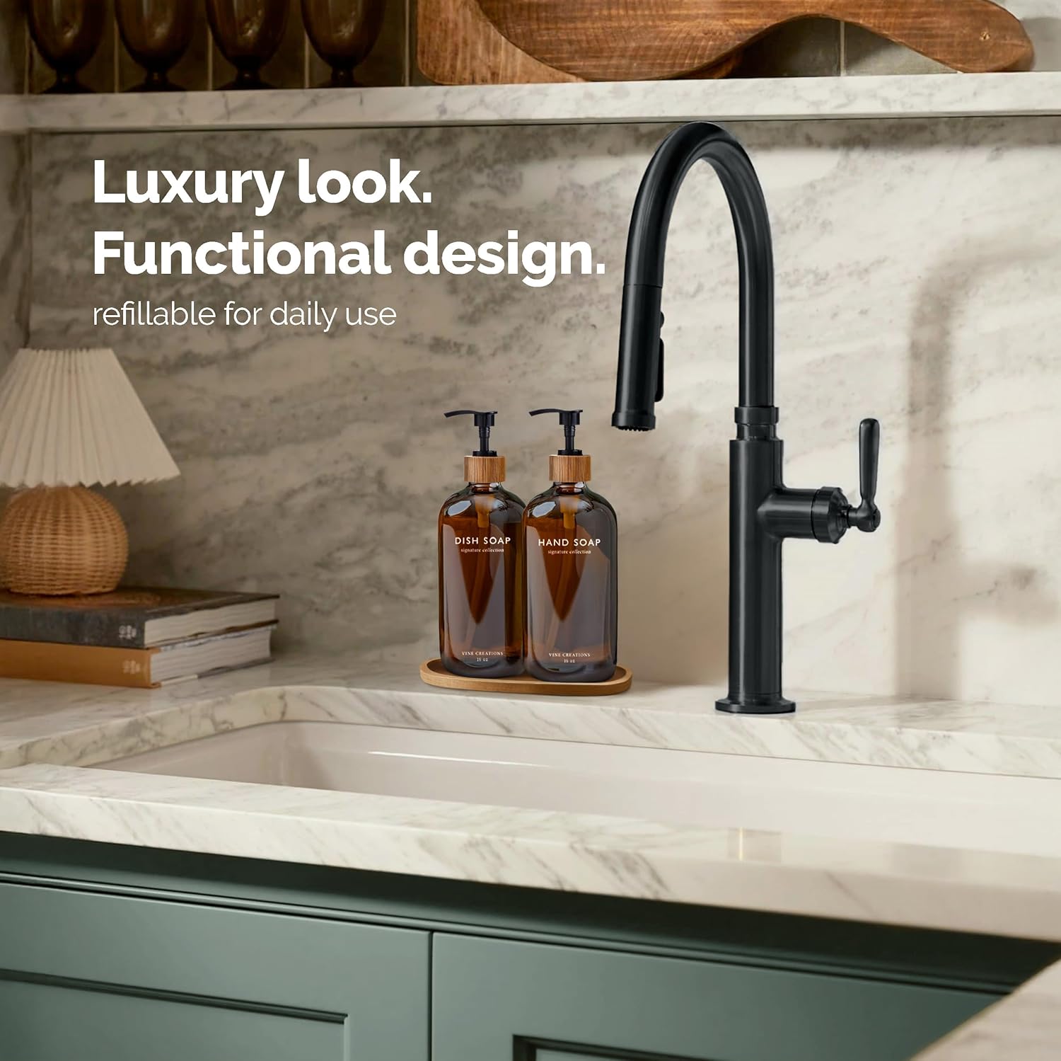 - STYLE YOU CAN FEEL – Heavier than standard dispensers, this amber hand and dish soap dispenser set of 2 brings substance and sophistication to your countertop. Built to last and made to impress—with a matching bamboo tray that keeps your set tidy, stylish, and perfectly organized.