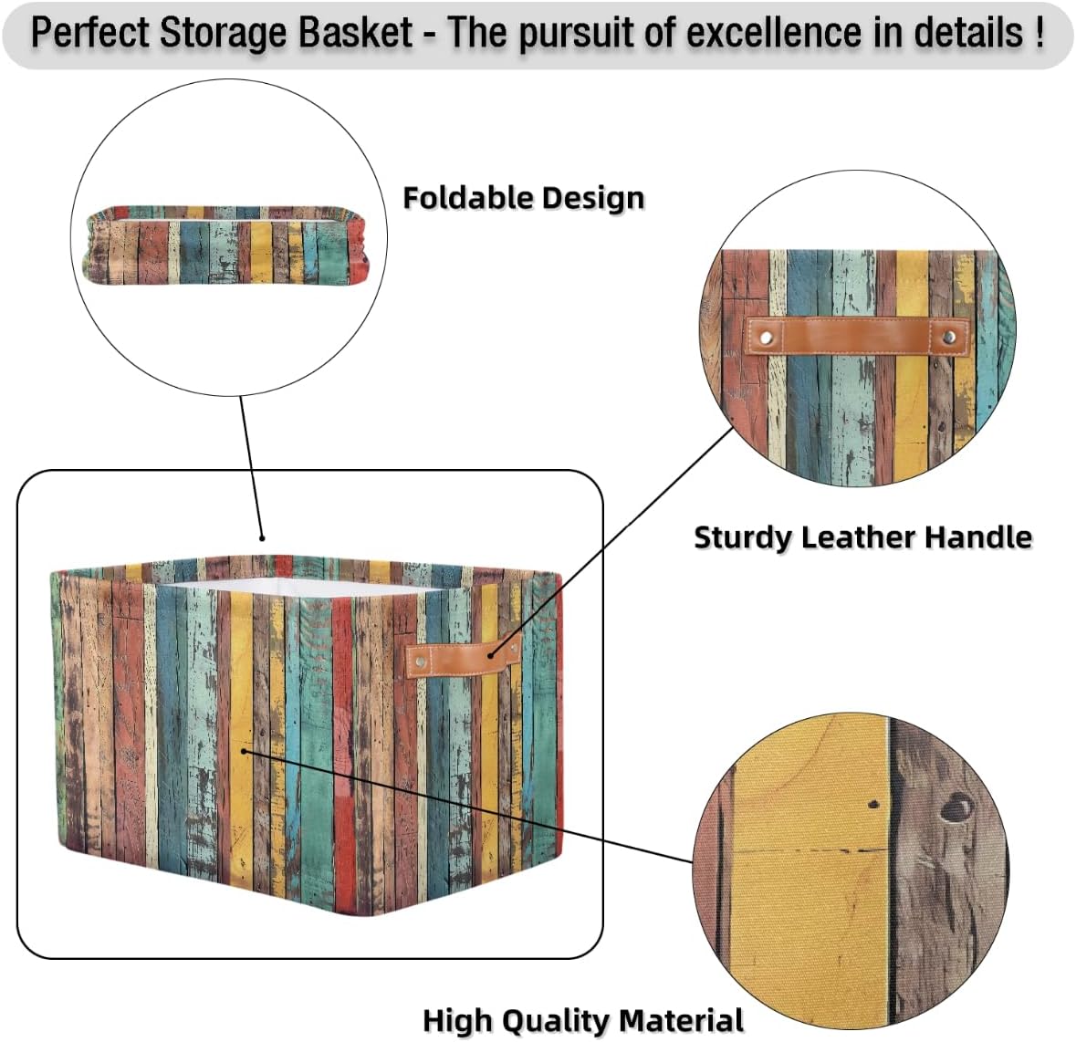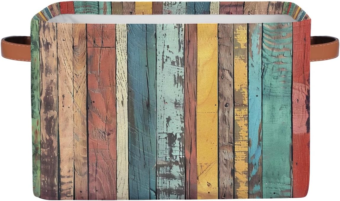 Rustic Wooden Storage Basket for Shelves, Storage Bins with Handles, Collapsible Basket for Organizing, Closet Toy Baskets for Nursery Room, 15x11x9.5 in, Canvas, Rainbow Colored