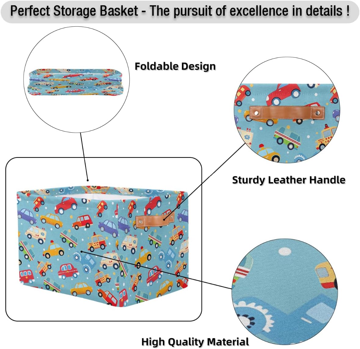 Cartoon Cars Storage Basket for Shelves, Storage Bins with Handles, Collapsible Basket for Organizing, Closet Toy Baskets for Nursery Room, 15x11x9.5 in, Canvas, Cute Cars Trucks