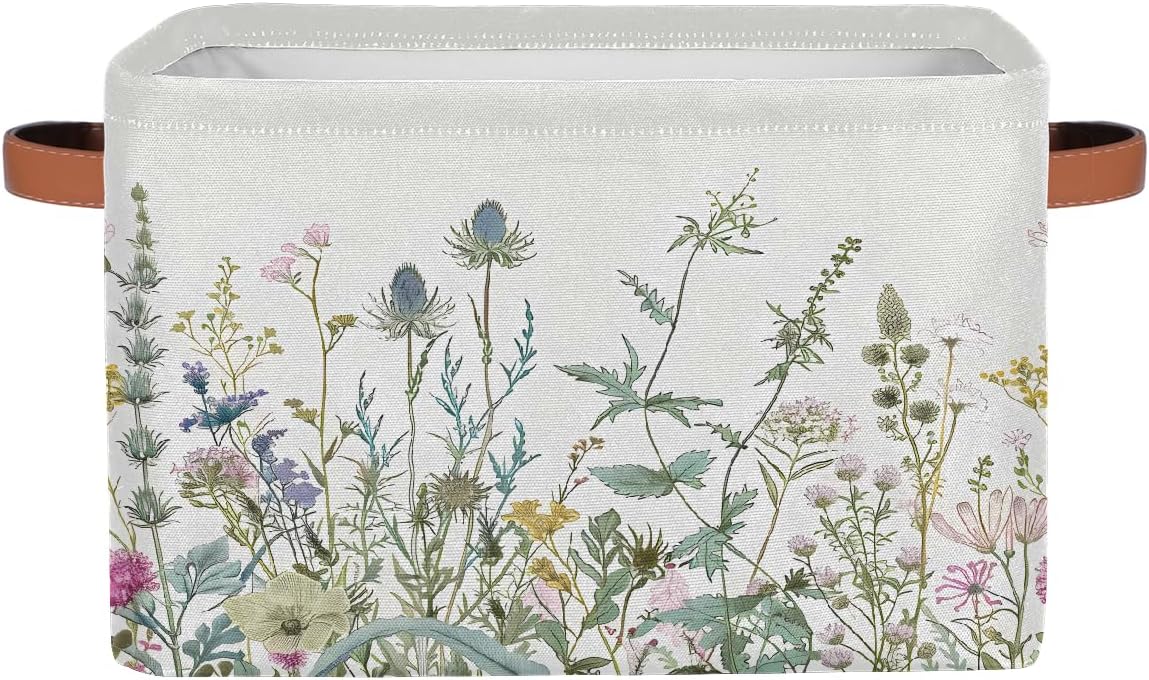 Wildflowers Leaves Storage Basket for Shelves, Storage Bins with Handles, Collapsible Basket for Organizing, Closet Toy Baskets for Nursery Room, 15x11x9.5 in, Canvas, Herbal Wildflower