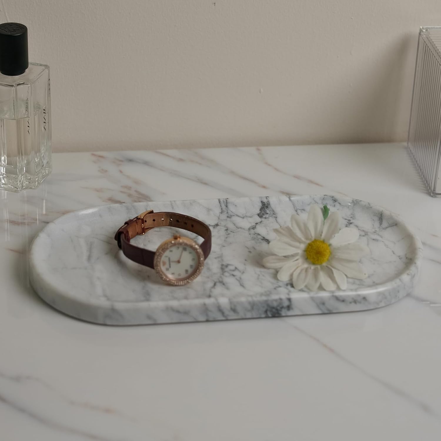 Natural Marble Tray 9.8”x4.7”x0.6” | Hand-Polished Oval Stone Tray for Bathroom Vanity & Jewelry Display – Durable, Unique Vein Patterns (Carrara White)