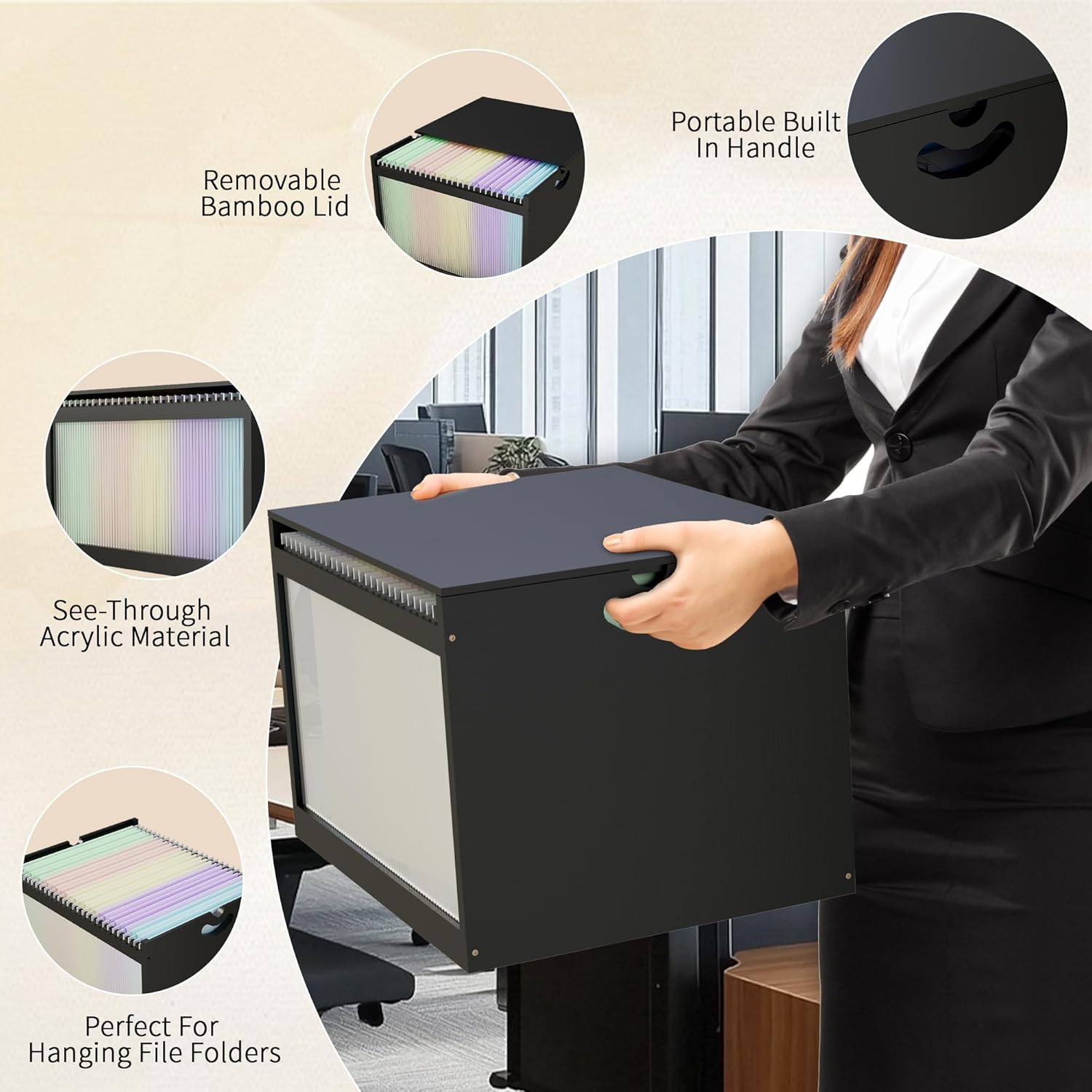 Bamboo Hanging File Boxes with Lids 2 Pack, File Organizer Box for Letter/Legal File, File Box with Hanging Folders Acrylic Light Easy Assembly File Storage Boxes for Home Office, Black